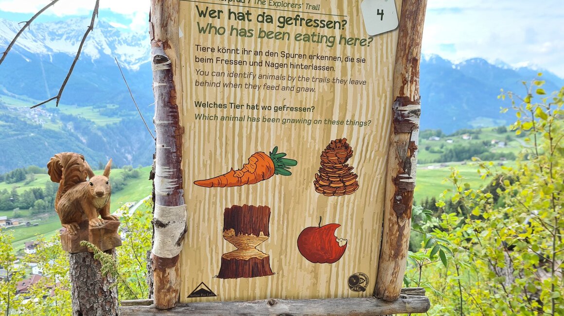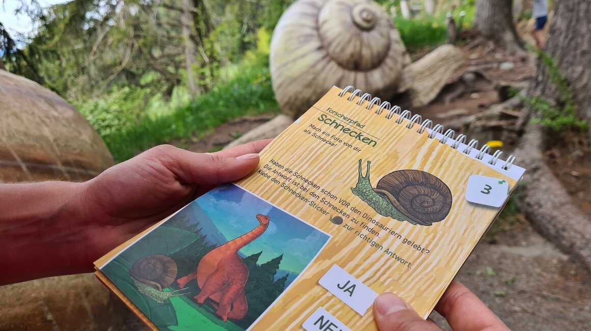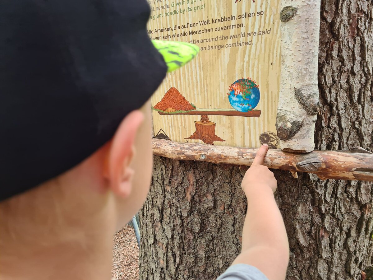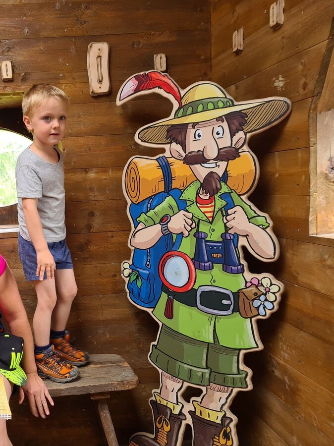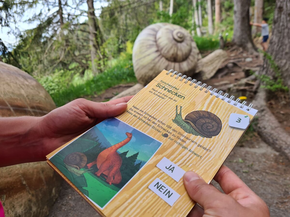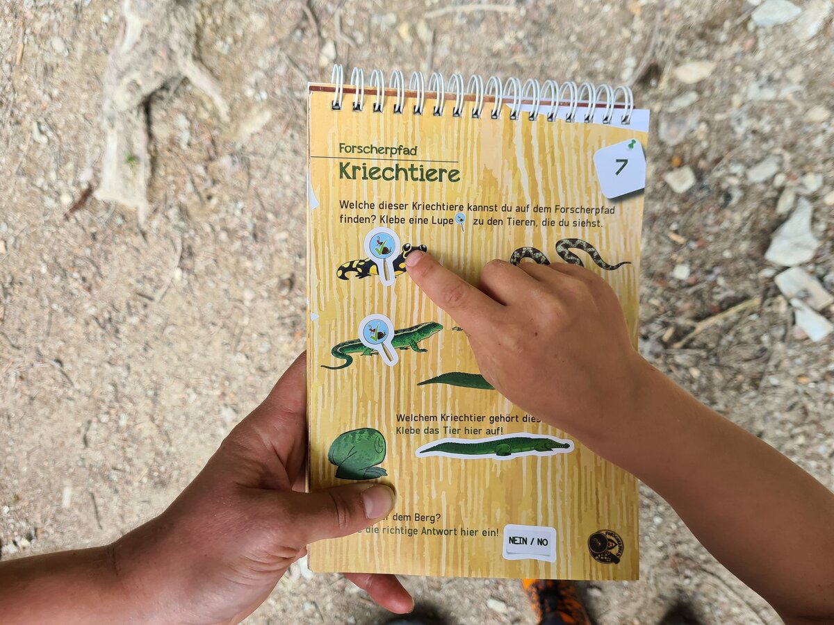 Ein riesiger Forscher mit gelbem Hut beäugt uns bereits am Eingangsportal mit seiner XXL-Lupe. Nun wird es Zeit, den Rätselblock mit den bunten Stickern, den wir im Infobüro in Ladis gekauft haben, auszupacken. Hinter dem Verkauf des Rätselblocks steckt übrigens ein VERSPRECHEN an alle kleinen Abenteurer. Die 3 Euro landen nämlich in einem Topf für den GUTEN ZWECK. Mit einem guten Bauchgefühl und reichlich Neugierde in unseren zappeligen Füßen blättern wir vorbei an den Rätseln des Piraten- und Hexenweges und starten unser Abenteuer im hinteren Drittel des Stickerblocks.