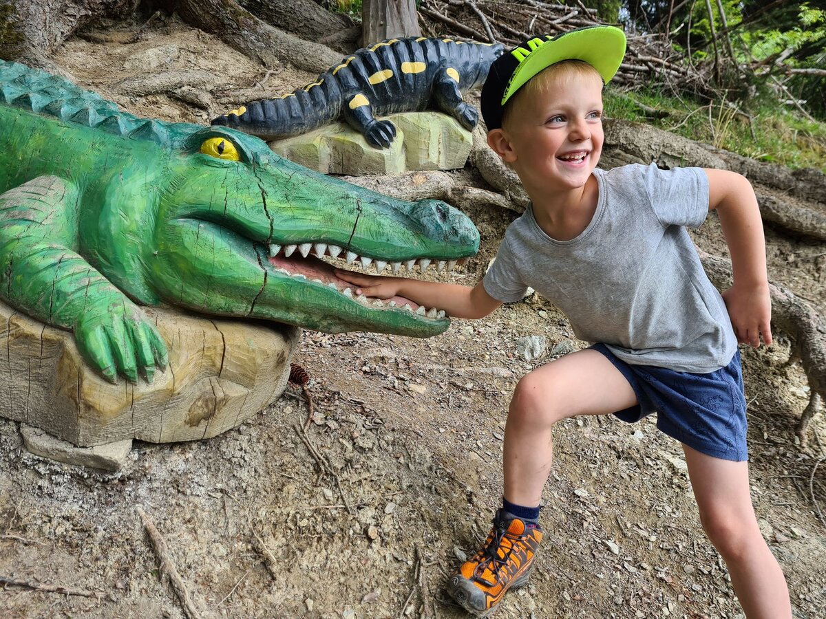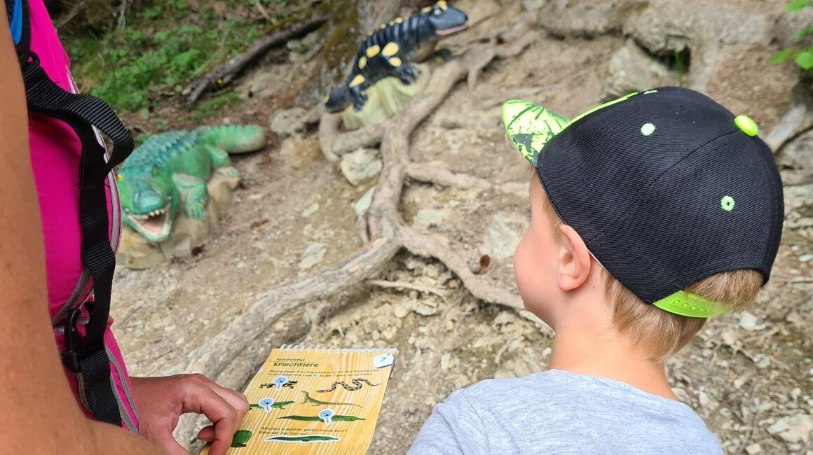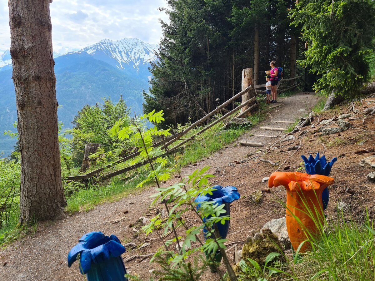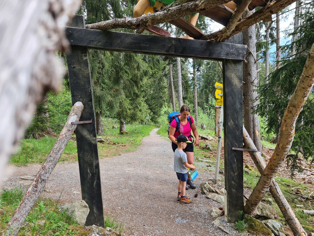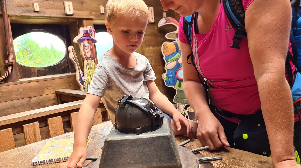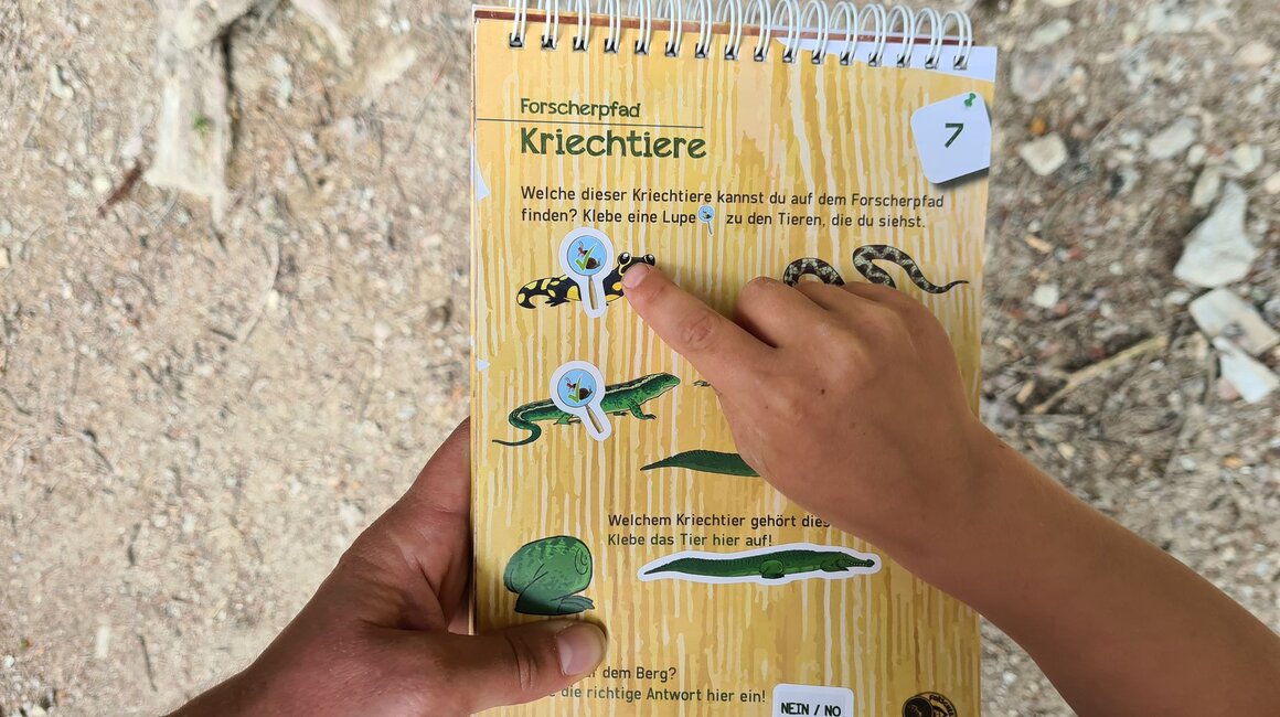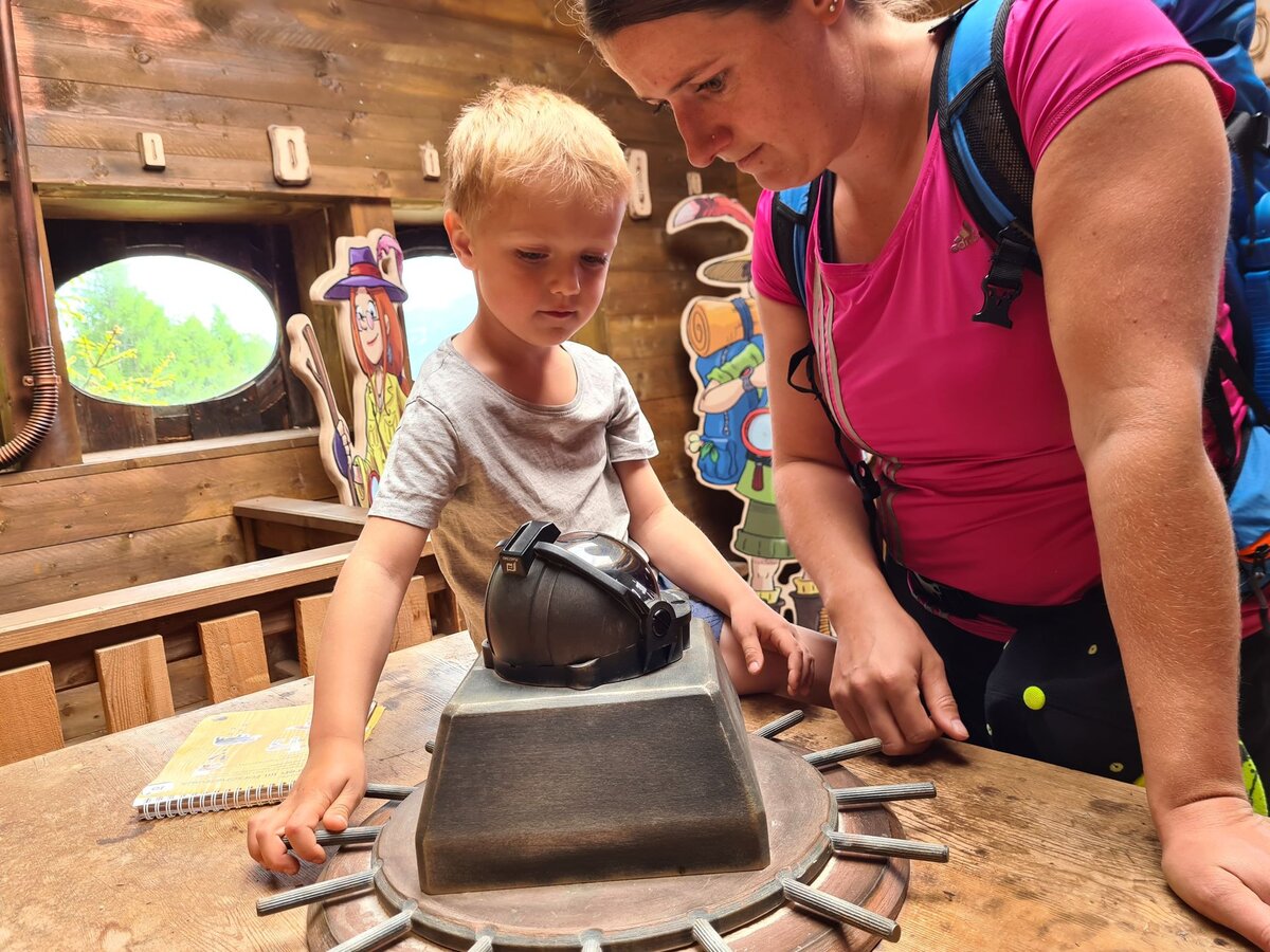 Ein riesiger Forscher mit gelbem Hut beäugt uns bereits am Eingangsportal mit seiner XXL-Lupe. Nun wird es Zeit, den Rätselblock mit den bunten Stickern, den wir im Infobüro in Ladis gekauft haben, auszupacken. Hinter dem Verkauf des Rätselblocks steckt übrigens ein VERSPRECHEN an alle kleinen Abenteurer. Die 3 Euro landen nämlich in einem Topf für den GUTEN ZWECK. Mit einem guten Bauchgefühl und reichlich Neugierde in unseren zappeligen Füßen blättern wir vorbei an den Rätseln des Piraten- und Hexenweges und starten unser Abenteuer im hinteren Drittel des Stickerblocks.