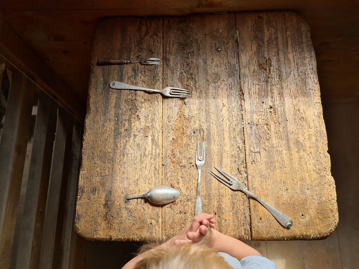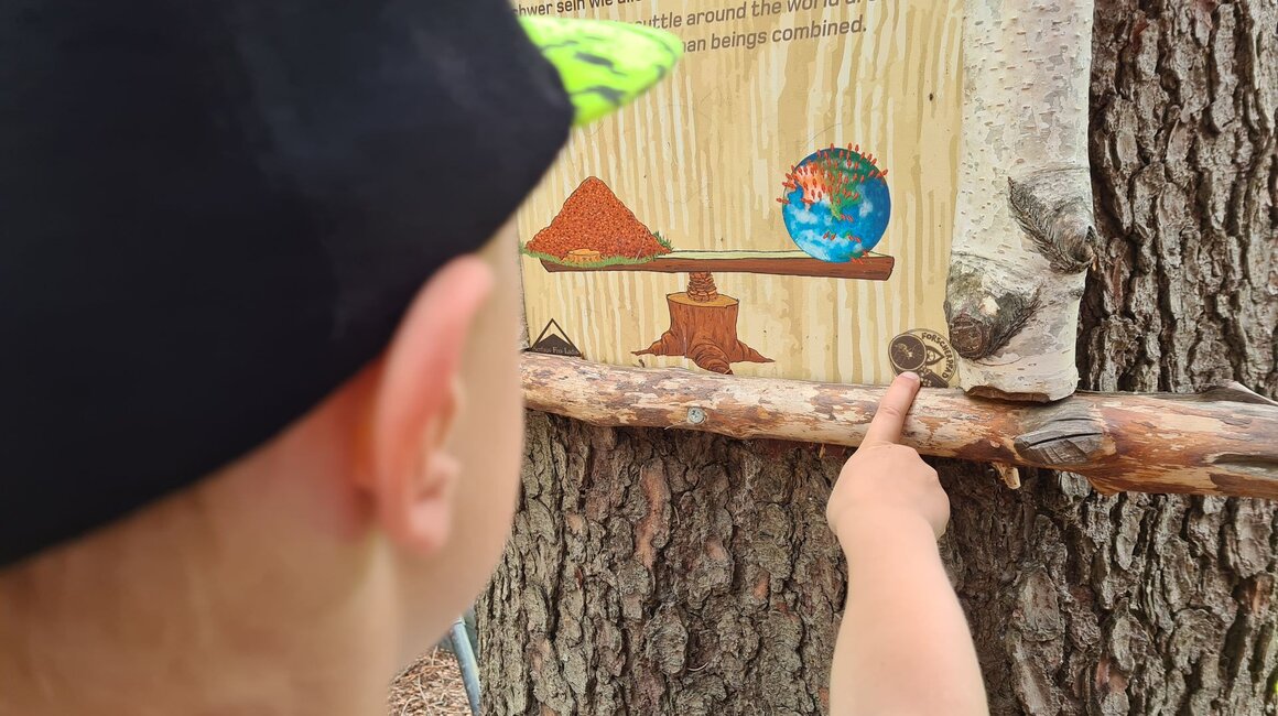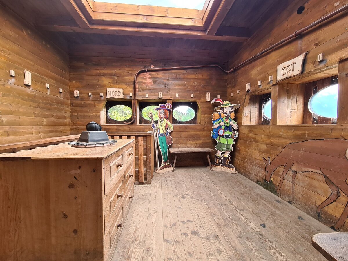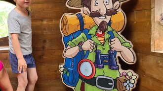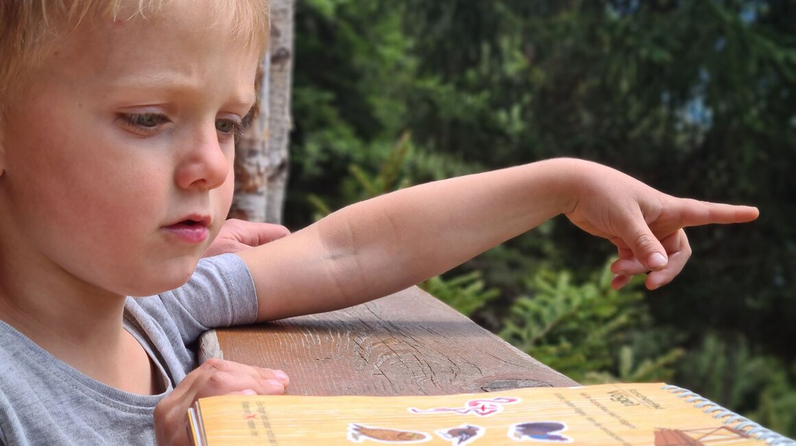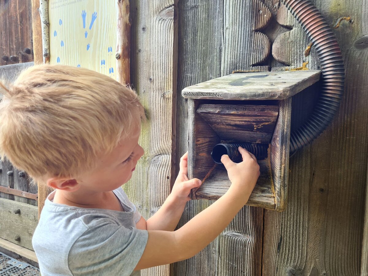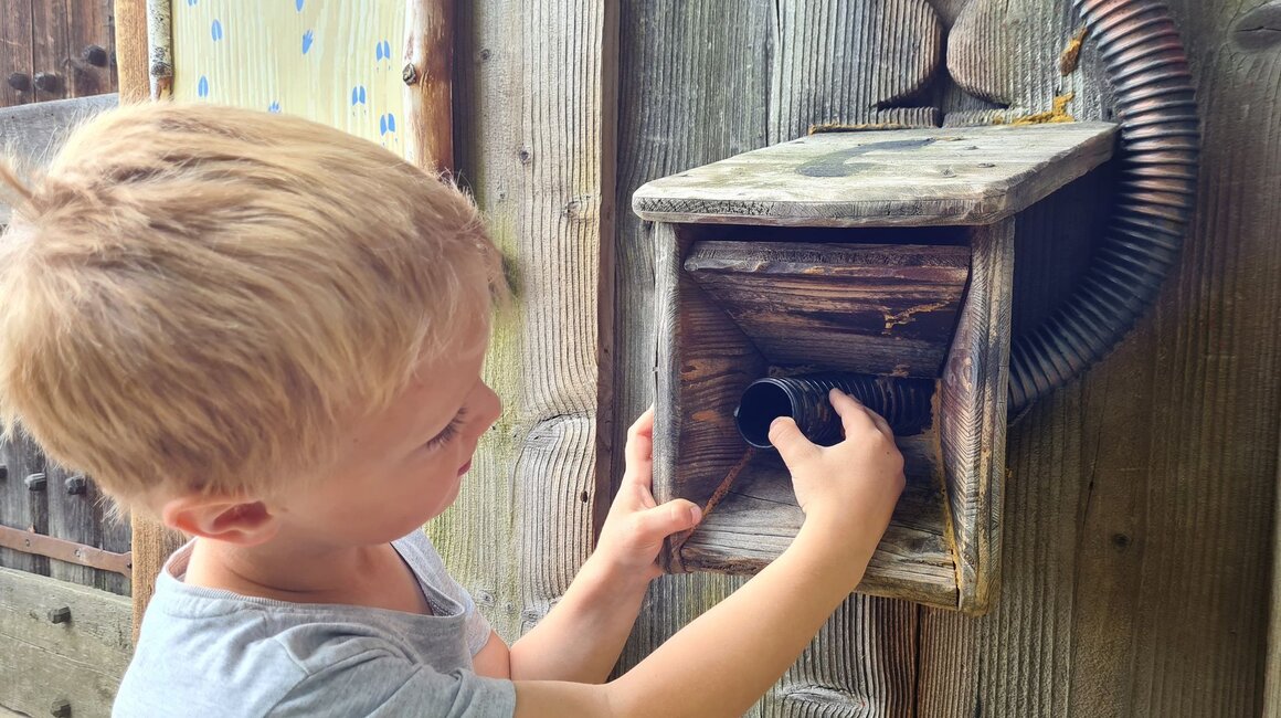 Ein riesiger Forscher mit gelbem Hut beäugt uns bereits am Eingangsportal mit seiner XXL-Lupe. Nun wird es Zeit, den Rätselblock mit den bunten Stickern, den wir im Infobüro in Ladis gekauft haben, auszupacken. Hinter dem Verkauf des Rätselblocks steckt übrigens ein VERSPRECHEN an alle kleinen Abenteurer. Die 3 Euro landen nämlich in einem Topf für den GUTEN ZWECK. Mit einem guten Bauchgefühl und reichlich Neugierde in unseren zappeligen Füßen blättern wir vorbei an den Rätseln des Piraten- und Hexenweges und starten unser Abenteuer im hinteren Drittel des Stickerblocks.