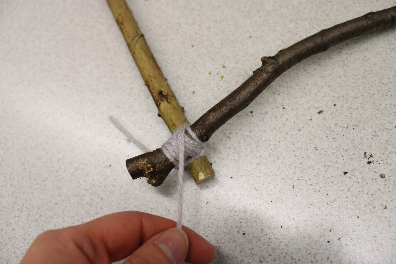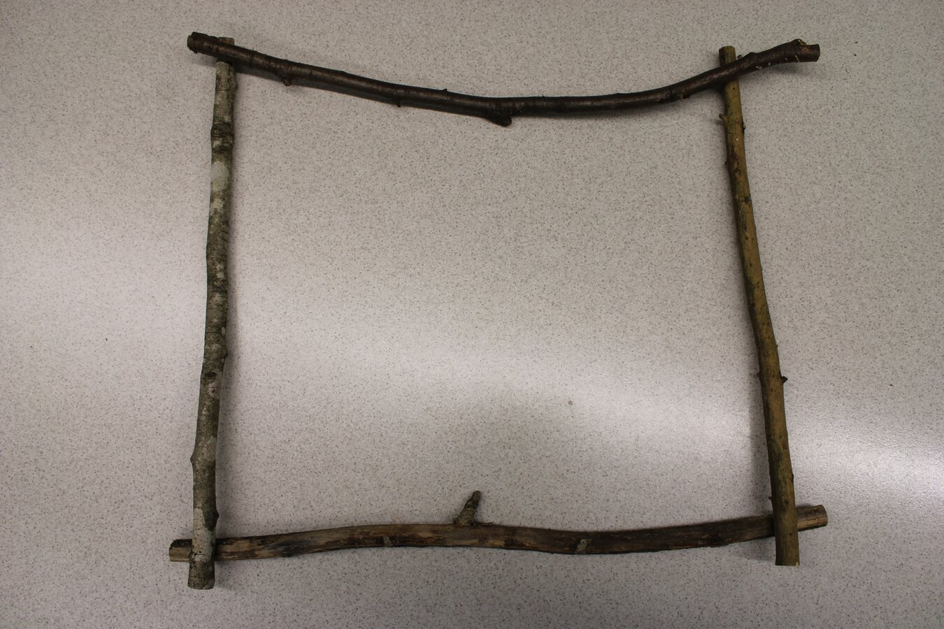 Lege die vier Stöcke zu einem Rechteck zusammen. Falls du keine passenden Stöcke findest, könnt ihr sie mit einer Säge zurechtsägen. Binde die Enden mit einer Schnur fest, sodass ein stabiler Rahmen entsteht.