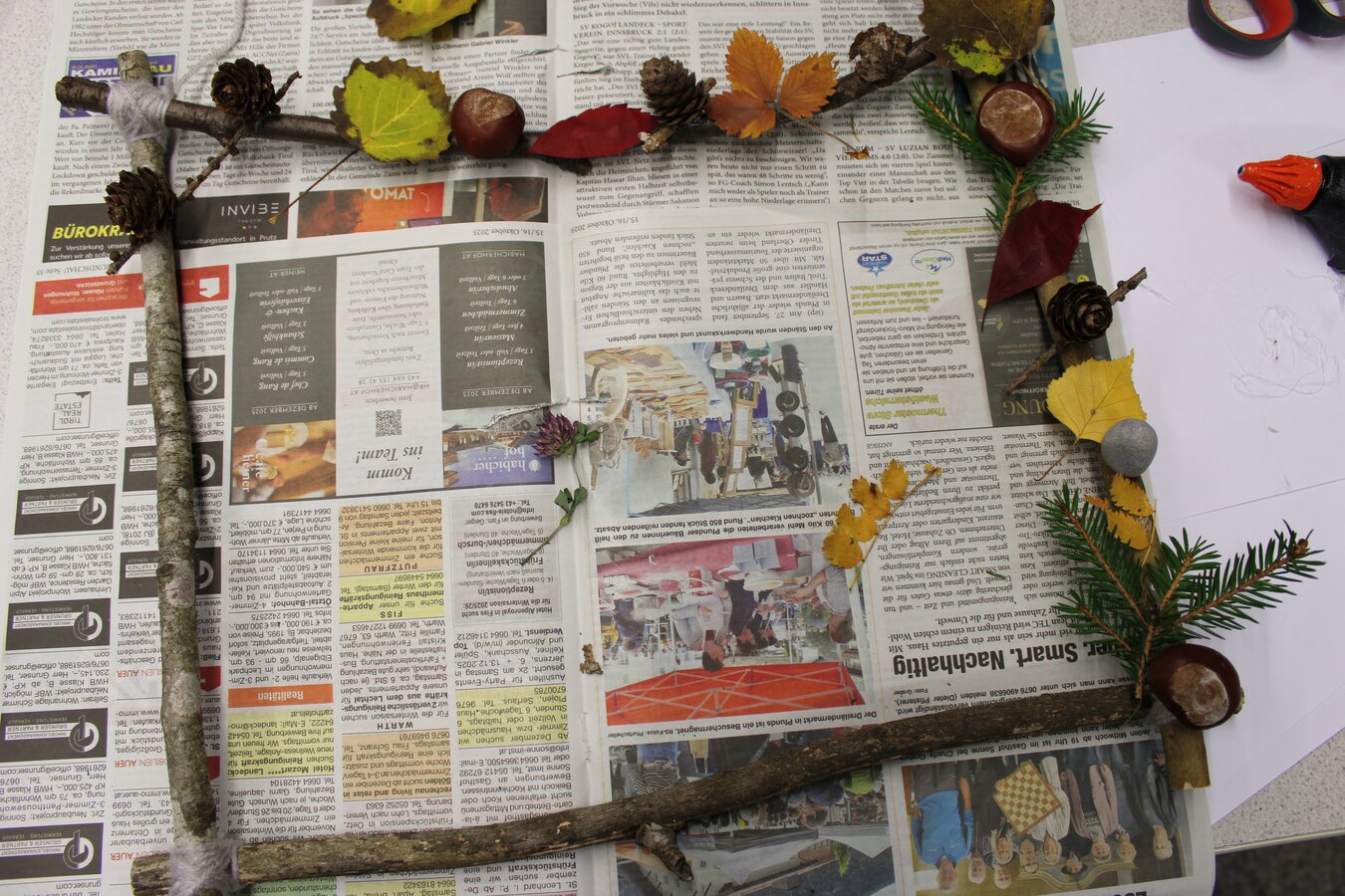 Mache mit deinen Eltern oder Freunden einen Spaziergang und sammle, was der Herbst zu bieten hat – Blätter, Zapfen, Kastanien, kleine Zweige, Rinde oder Moos.
