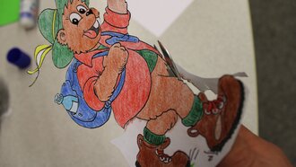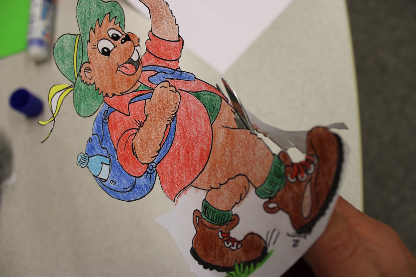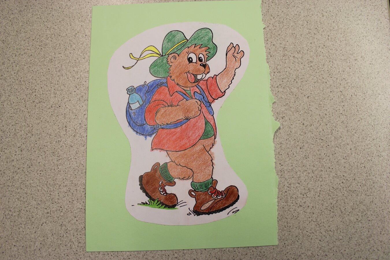 In der Mitte des Rahmens spazieren Murmli und Berta. Such dir eine Malvorlage auf der Murmli & Berta Website aus und drucke sie aus. Mit Buntstiften malst du sie bunt aus. Zur besseren Stabilität klebst du sie auf Tonkarton, schneidest sie anschließend aus und klebst sie auf den unteren Stock.