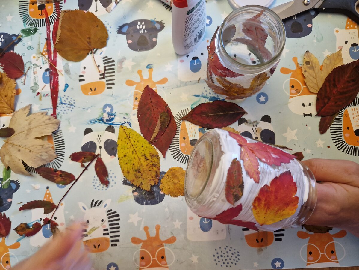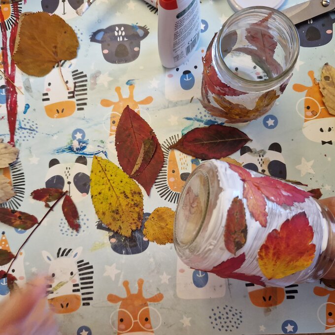 Nun das saubere Einmachglas abschnittsweise mit Kleber bestreichen und die Blätter verteilt anordnen.