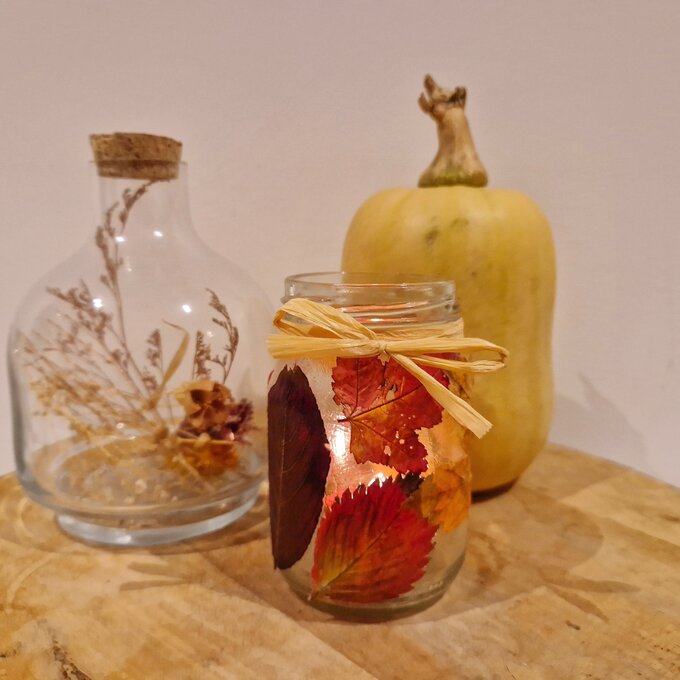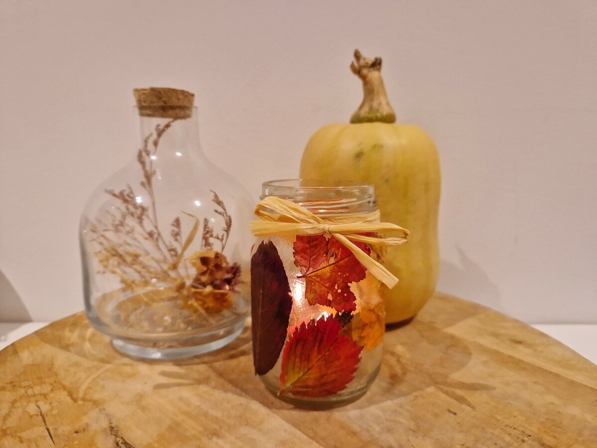 Ein Teelicht oder eine Duftkerze in die Gläser stellen und schon ist das herbstliche Windlicht fertig!