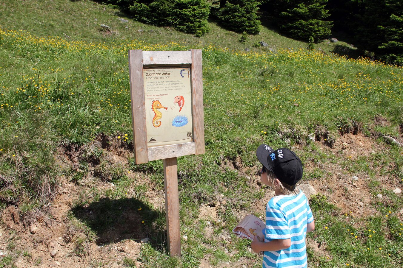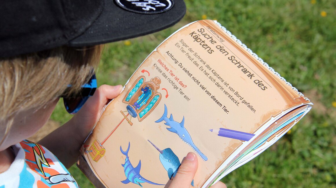 Gleich zu Beginn entdecken wir eine alte TRUHE, deren Inhalt schon die erste Frage im Abenteuerblock beantwortet. Zahlreiche dieser Schatztruhen warten immer wieder entlang des Themenweges, natürlich immer mit einem Rätsel verbunden. Viele weitere Stationen sorgen für Rätselspaß und lassen die Zeit wie im Flug vergehen. Ein Fass, in dem SAUERKRAUT gelagert war, der ANKER des Piratenschiffes, das KRÄHENNEST, die GALIONSFIGUR oder der SCHRANK des Käptens sind nur ein paar der vielen spannenden Stationen entlang der zwei Kilometer.