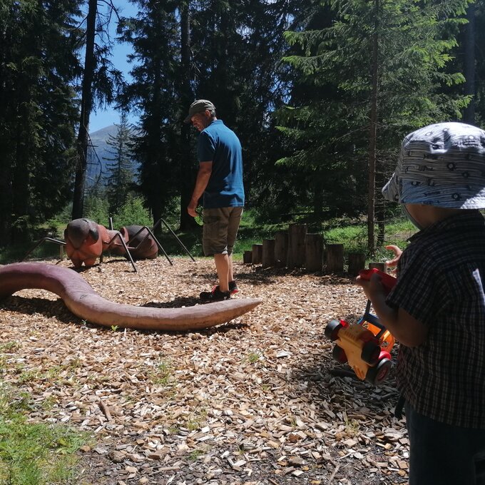 Besonders die überdimensionalen Pilze haben es ihm angetan. Darunter lässt es sich so gut verstecken! "Mamaaa, such mich!", hallt es da dann durch den Wald. Auch Zweifachmama Kathrin liebt das schattige Areal oberhalb von Ladis. Da es hier nicht allzu weitläufig und gut überschaubar ist, kann der Kleine ohne Bedenken selbst auf Entdeckungstour gehen. Kathrin kann sich dann auch mal entspannt zurücklehnen und die Zeit mit ihrer kleinen Tochter Mathea genießen, die ruhig im Tragetuch schläft.