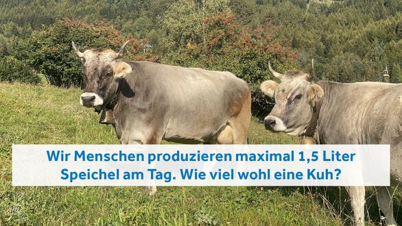 Liter Speichel. So viel Speichel produziert eine ausgewachsene Kuh am Tag! Diese Menge an Flüssigkeit würde 1,5 Badewannen füllen. Zum Vergleich: Wir Menschen produzieren maximal 1,5 Liter Speichel am Tag. Warum, fragst du dich? Bei Kühen findet die Verdauung hauptsächlich im „Pansen“ (Vormagen) ohne Sauerstoff statt. Dabei werden ganz schön viele Fettsäuren gebildet, welche den PH-Wert im Pansen senken. Das heißt, dass der Magen sauer wird. Vergleichbar mit dem Sodbrennen bei Menschen. Würde eine Kuh nicht so viel Speichel zur Neutralisation produzieren, würde sie durch die Übersäuerung sogar sterben.