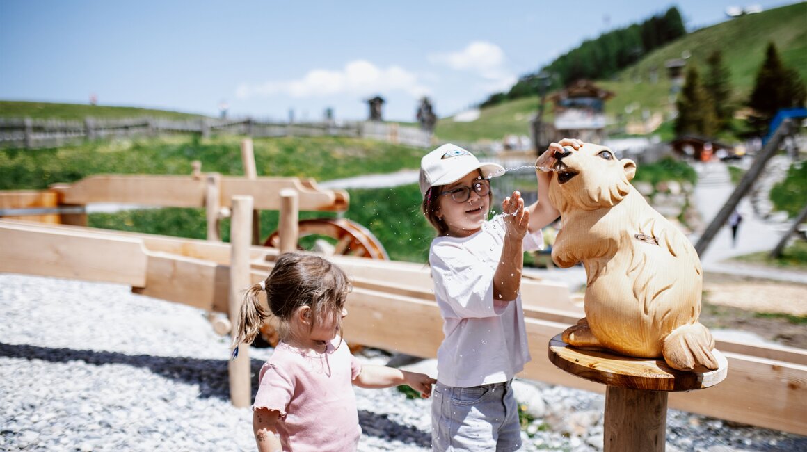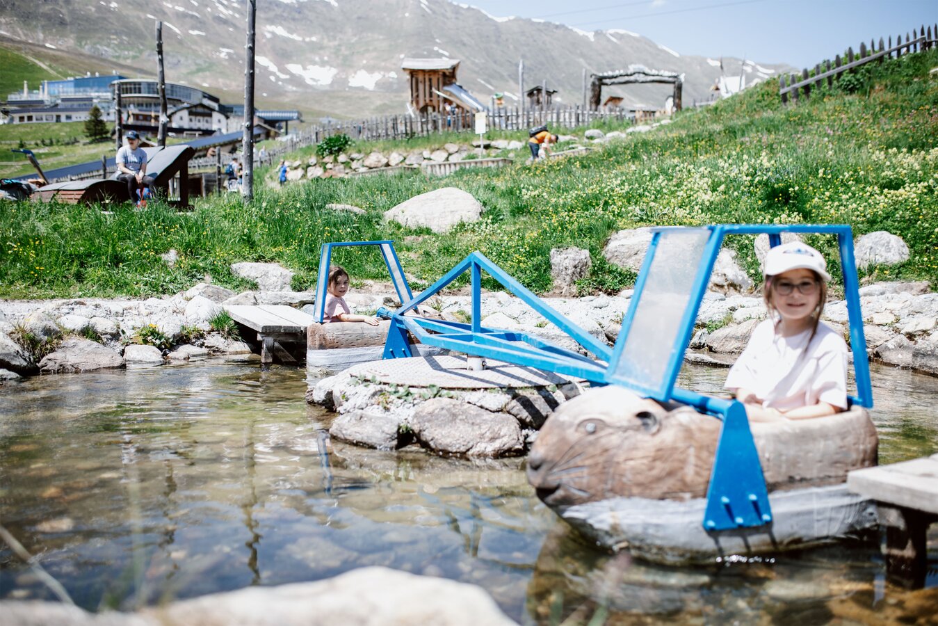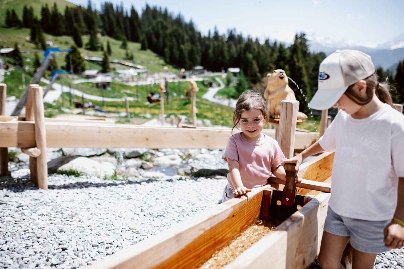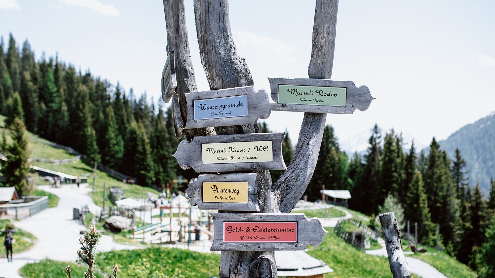 Von der Bergstation aus führt ein kurzer Spazierweg zum Murmliwasser, das auf 1.980 Metern Seehöhe liegt. Für den Rückweg steht vom Spielpark aus ein Förderband zur Verfügung. Besonders mit müden Kindern und Kinderwagen ist dies äußerst praktisch. Die namensgebenden Murmli – also die Murmeltiere – sind hier schon überall zu finden: Als überlebensgroße, aufblasbare Figuren, aus Holz geschnitzt und sogar als lebende Tiere im Murmeltiergehege, wie Ella und Flora später entdecken werden.