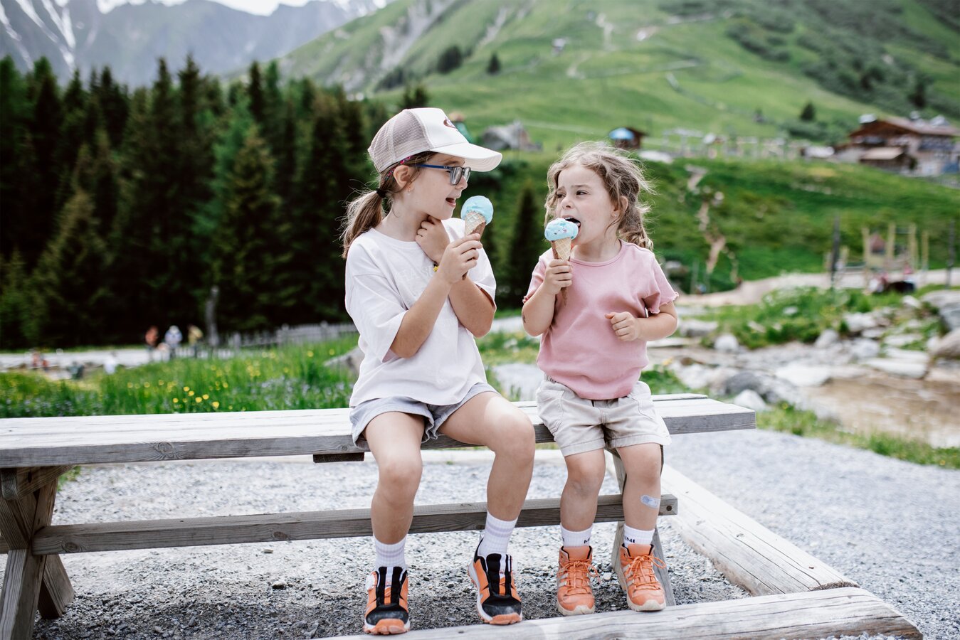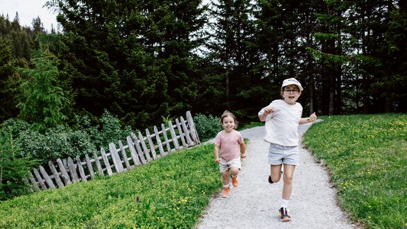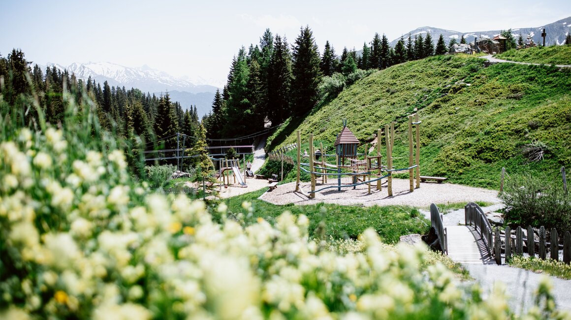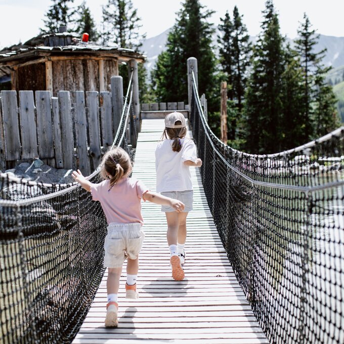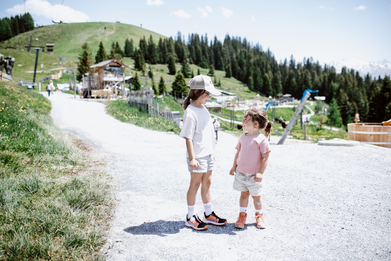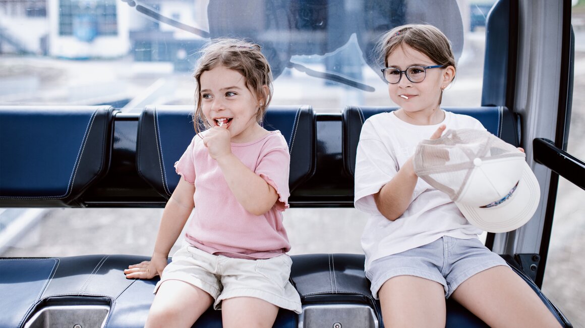 Von der Bergstation aus führt ein kurzer Spazierweg zum Murmliwasser, das auf 1.980 Metern Seehöhe liegt. Für den Rückweg steht vom Spielpark aus ein Förderband zur Verfügung. Besonders mit müden Kindern und Kinderwagen ist dies äußerst praktisch. Die namensgebenden Murmli – also die Murmeltiere – sind hier schon überall zu finden: Als überlebensgroße, aufblasbare Figuren, aus Holz geschnitzt und sogar als lebende Tiere im Murmeltiergehege, wie Ella und Flora später entdecken werden.