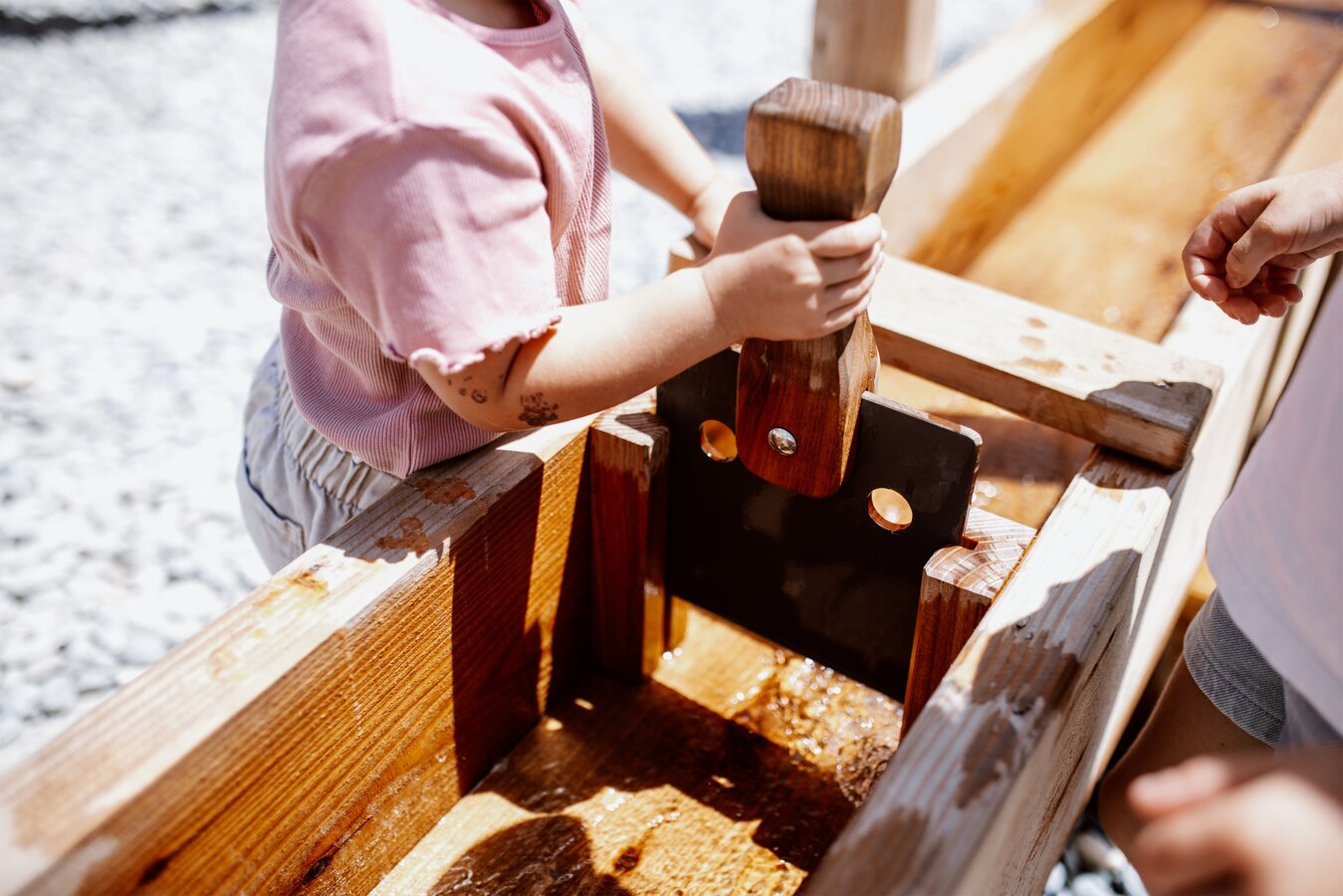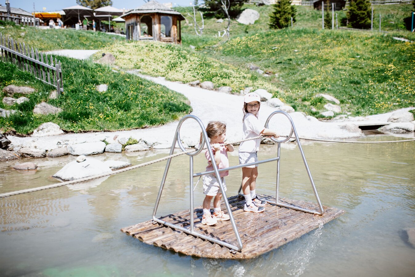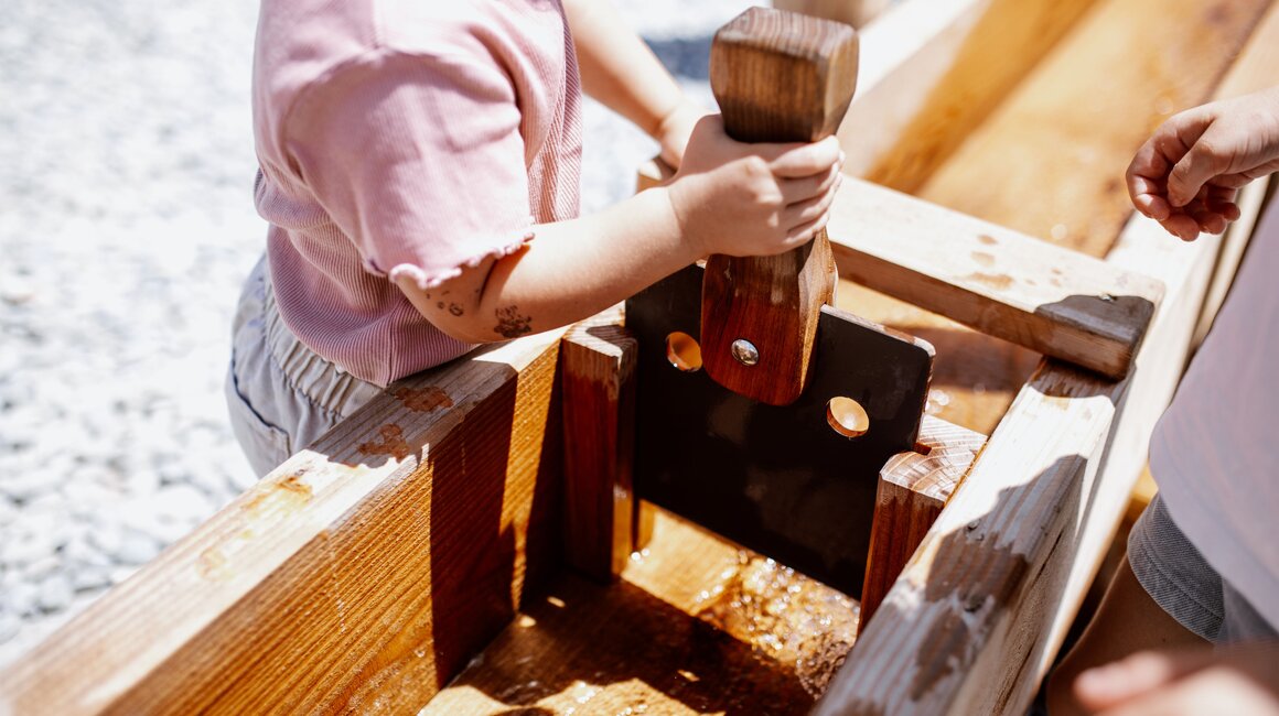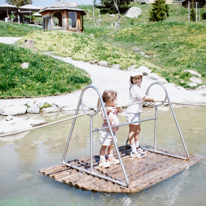 Weiter geht’s zu einem kleinen Teich, in dem zwei Murmeltier-Boote warten. Der Clou dabei: Damit sich die Boote bewegen, müssen sie durch ein Fahrrad, das am Seerand steht, angetrieben werden. So wird auch den Großen nicht langweilig! Besonders aufregend ist die Fahrt mit dem Floß – oder wie Ella es nennt: mit dem „Stehboot.“ Nach der Überfahrt ist erst einmal Pause angesagt. Hier bietet sich das Murmli Kiosk an, in dem täglich Snacks, Eis und Getränke serviert werden. Überall am Gelände gibt es außerdem überdachte und schattige Sitzgelegenheiten für Pausen zwischendurch.