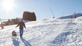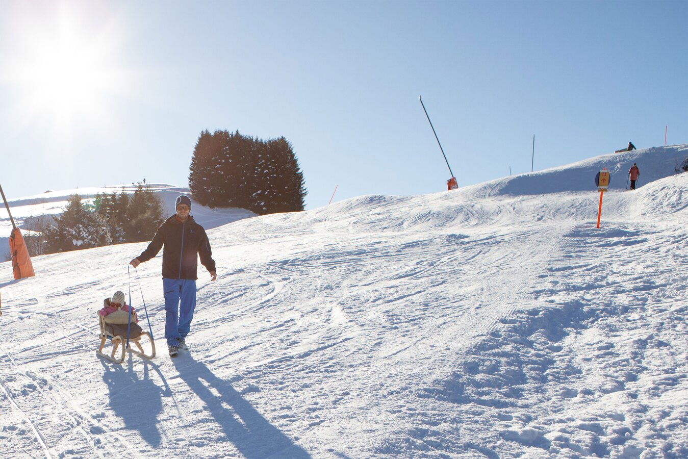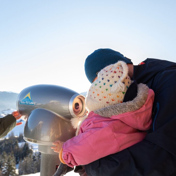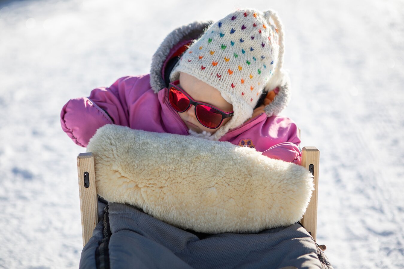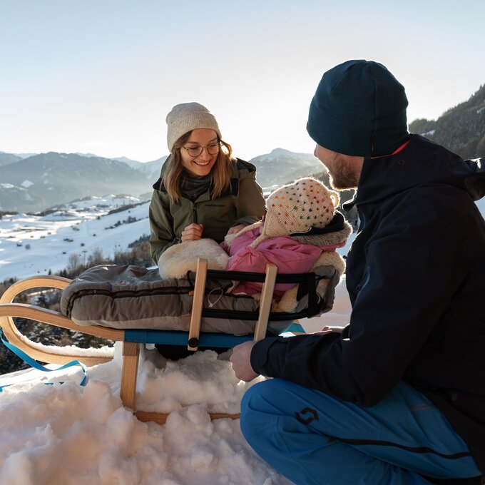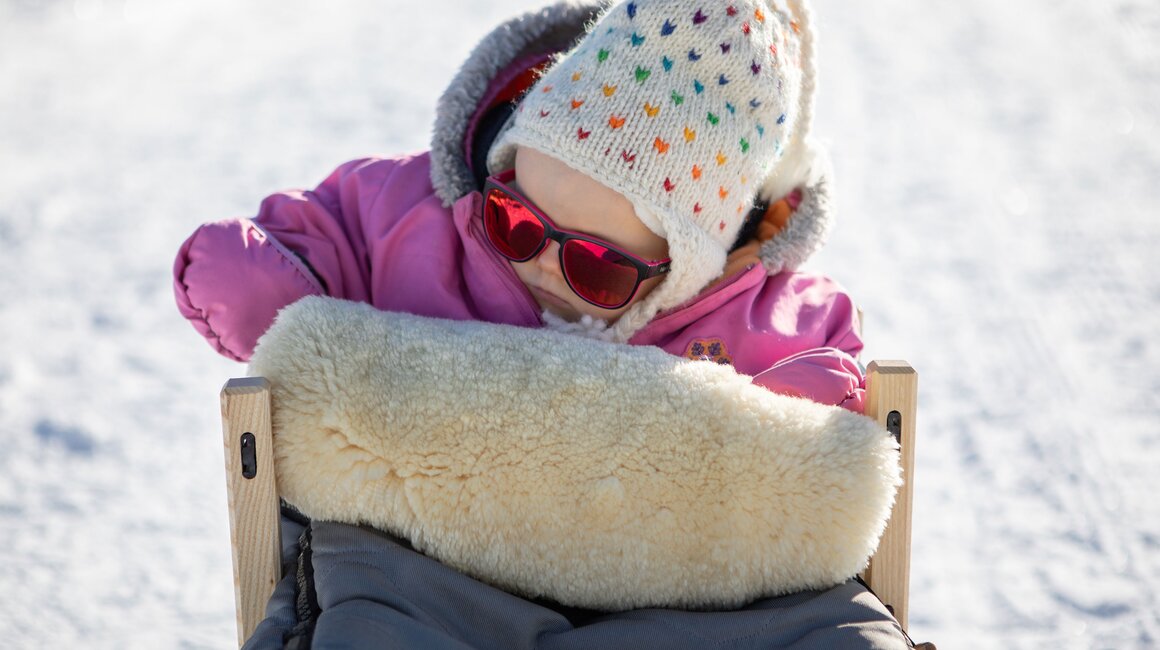 Mit einem Jahr ist unsere Tochter noch zu klein für die Piste, auch ein Schläfchen im Kinderwagen soll es heute nicht werden. Denn was Mama und Papa auf zwei Beinen genießen, soll auch dem Nachwuchs sitzend zuteilwerden: Aussicht und Wintersonne. Gesagt, getan.