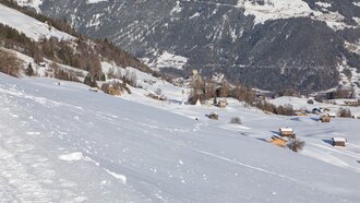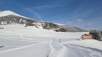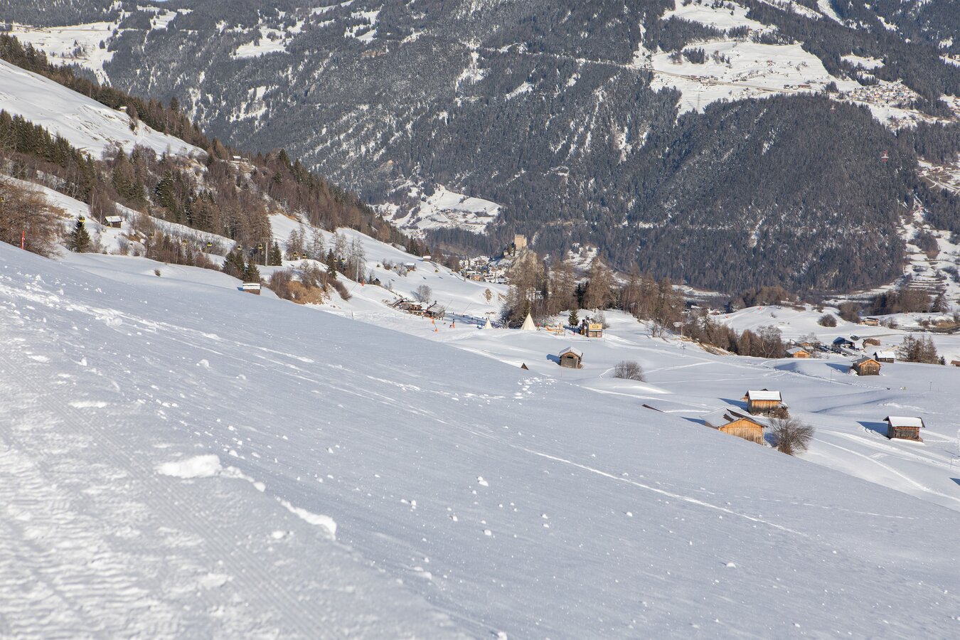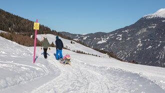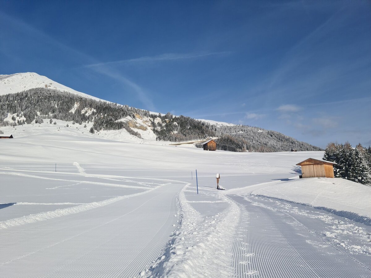 Leicht ansteigend, breit und offen führt uns der Pfad allmählich vom Ortsrand von Fiss weg Richtung Ladis. Da die Nächte zuvor recht kalt waren, ist der Schnee heute schön griffig. Das Ziehen der Rodel geht somit wie am Schnürchen und das Trio kann die Landschaft genießen, ohne gleich aus der Puste zu kommen. Zu sehen gibt es vieles: Am Wegesrand grüßen uns holzige Heustadel mit ordentlich Zuckerguss auf der Haube sowie sportliche Langläufer, die sich gekonnt an uns vorbeischlängeln und in die Pahlloipe einspuren.