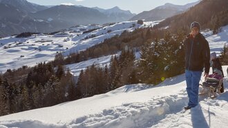 Noch zu klein für die Piste und schon zu groß für den Kinderwagen? Dann ist im Winter die Rodel mit Sitzlehne das passende Gefährt für Windelkandidaten. Ida liebt Ausflüge mit Ausblick und Apfelmus. Beides soll sie heute bekommen. Und wir Eltern möchten natürlich auch auf unsere Kosten kommen. Unser Ziel: Die Wohlfühlstation Falterjöchl in Ladis.