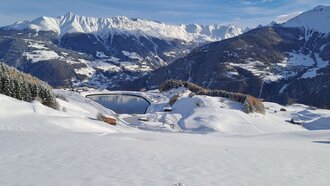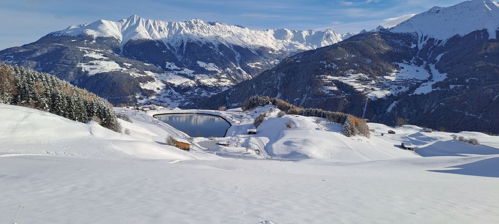 Nach ein paar weiteren Schritten sichten wir zu unserer Rechten dann den Wolfsee. Der Weg führt uns nämlich oberhalb des Sees und belohnt uns mit einer ordentlichen Fernsicht hinunter ins Inntal und den Eingang ins Kaunertal. Besonders beliebt unter Einheimischen: Die ortsnahe, alternative Winterwanderung direkt um den See. Heute geht's aber mal oben drüber.
