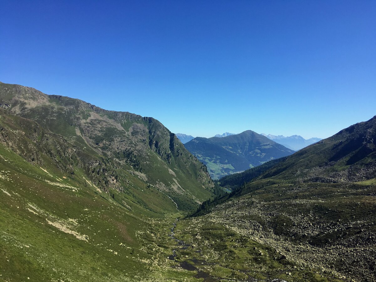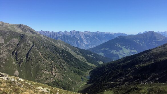 Als Wanderung wählten wir den Spinnseensteig, welcher mit einer Gehzeit von fünf Stunden, bis zur Schöngampalm, angeschrieben war (Weg 16). Da der Weg zwischenzeitlich etwas steinig verläuft, ist Trittsicherheit und gutes Schuhwerk erforderlich. Zudem sollte man berggeübt sein und über ausreichende Kondition verfügen. Motiviert und voller Vorfreude starteten wir in westliche Richtung und gingen zu Beginn ein kleines Stück den „Goldenen Mann Weg“ entlang. Nach wenigen Metern ging es für uns auf dem flachen Hangweg unterhalb des Zwölferkopfes hinüber zum Zwölferjoch. Hier empfiehlt sich ein Abstecher zur Aussichtsplattform Z1, die beeindruckende Weitblicke über unsere Region und die umliegende Bergwelt bietet.