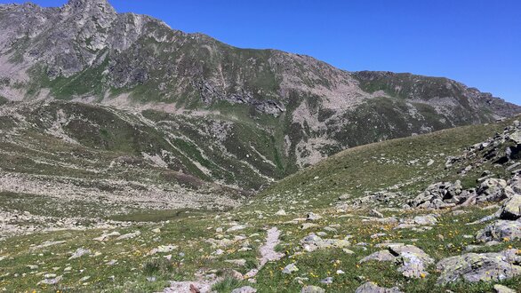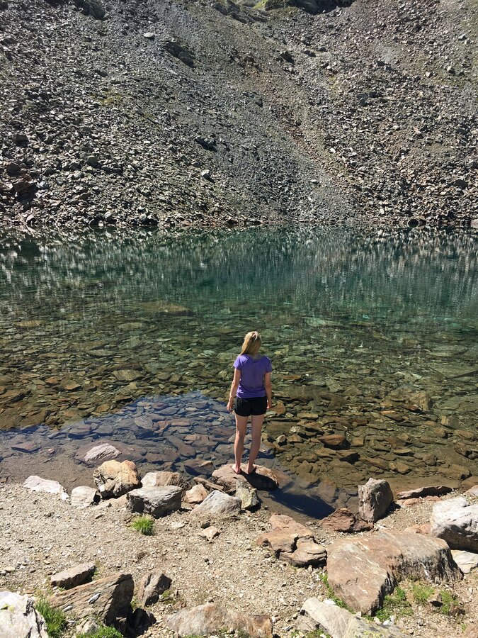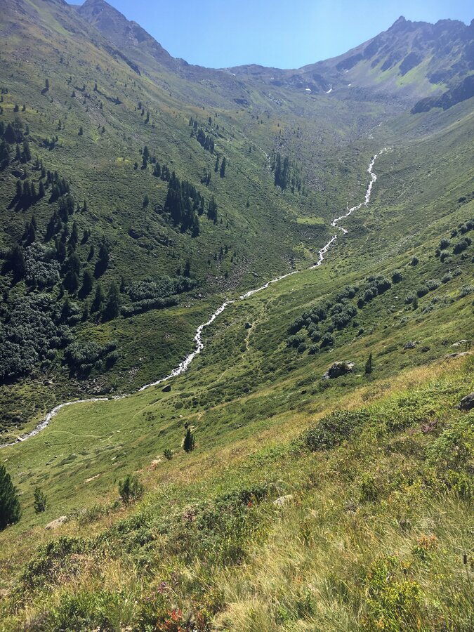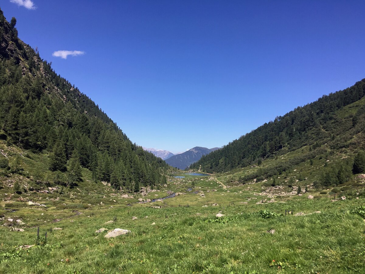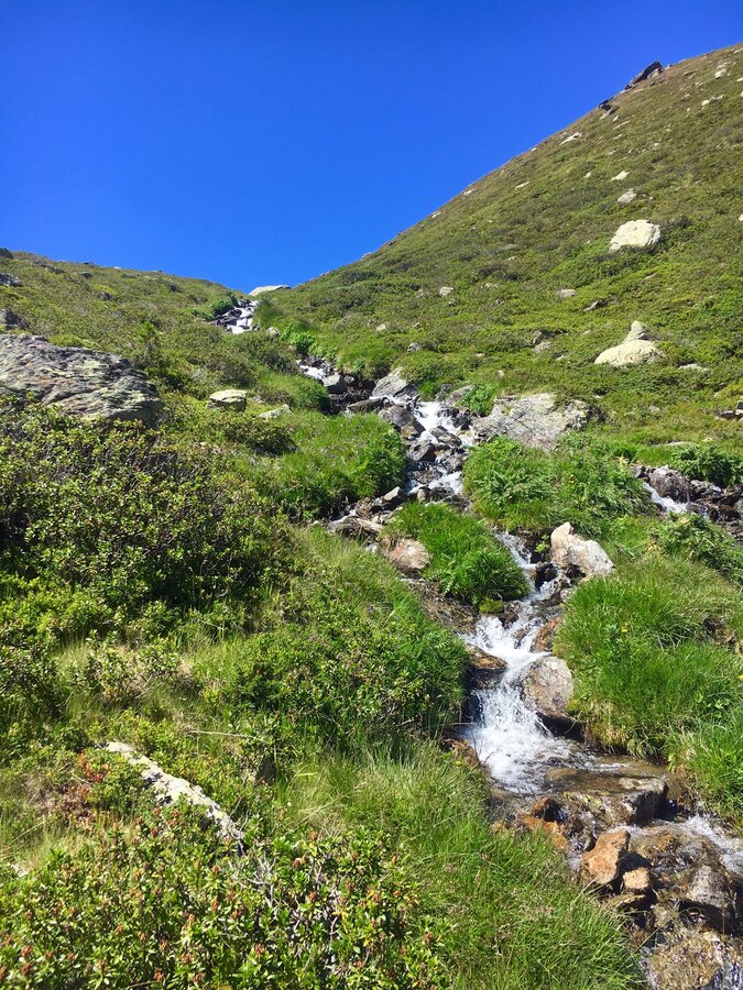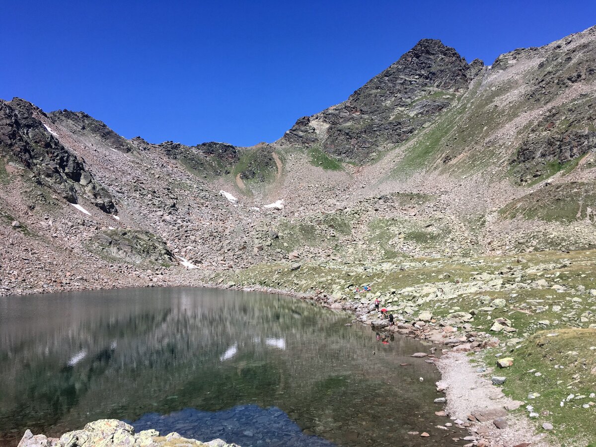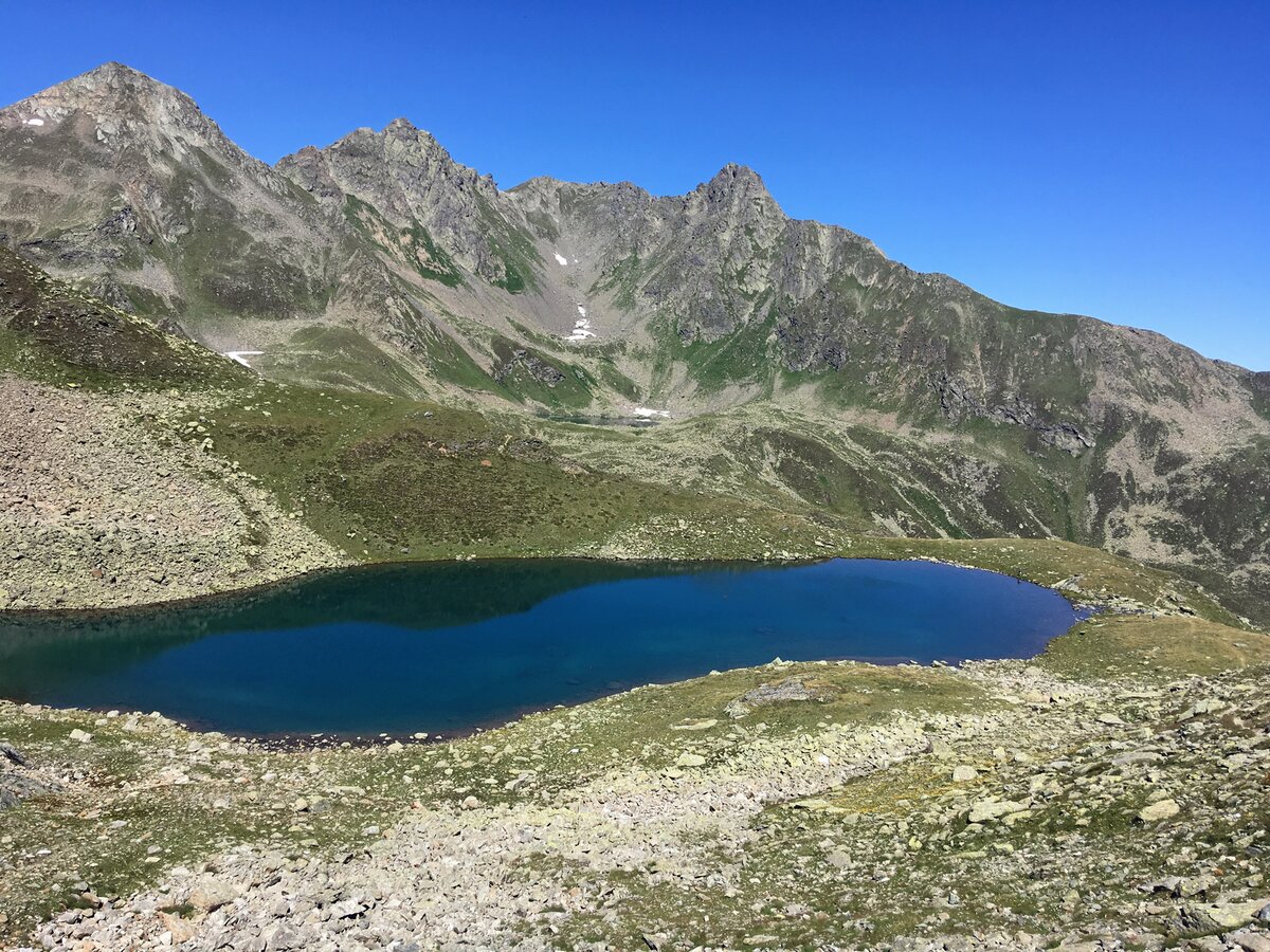 Das Plätschern des Bergbaches, der sich durchs komplette Tal schlängelt, begleitete uns. Nach ca. 1,5 Stunden Fußmarsch erreichten wir den Talgrund, wo wir nach einem leichten Anstieg eine kleine Holzbrücke überquerten. Zum Oberen Spinnsee ging es dann stetig (teilweise steil) ansteigend auf einem Bergrücken dem Bach entlang. Als wir nach rund einer Stunde oben an der Bergkuppe ankamen, stockte uns kurzzeitig der Atem. Denn was wir erblickten, war einfach atemberaubend! Zu unseren Füßen lag der kristallblau glitzernde Obere Spinnsee – der erste der beiden Bergseen.