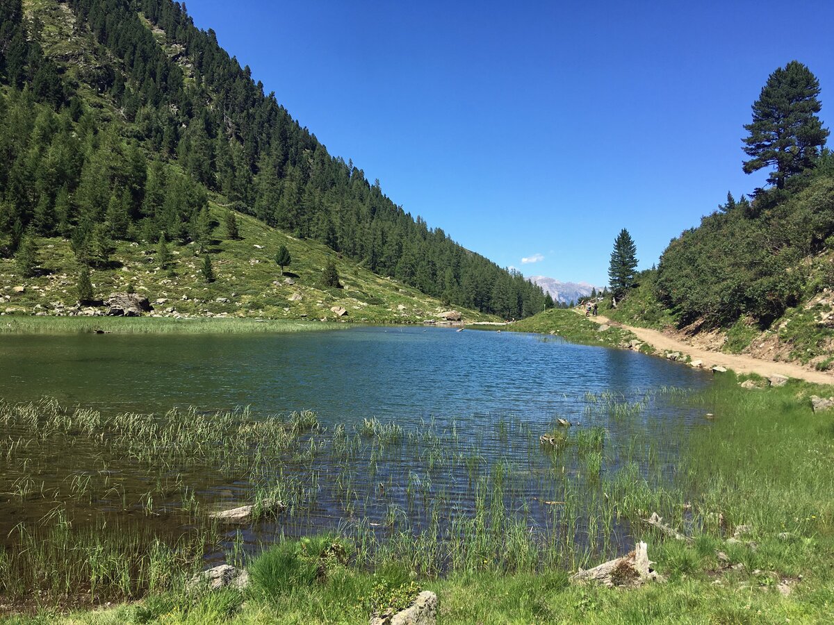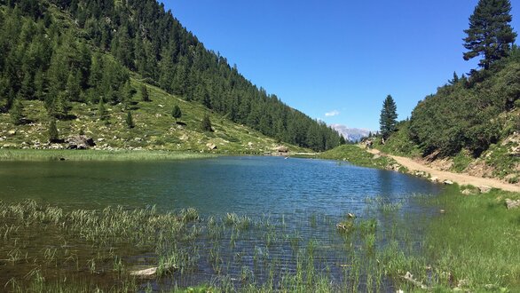 Nach einer dreiviertelstündigen Pause setzten wir unsere Tour fort. Bestens gestärkt machten wir uns auf den Weg zum Unteren Spinnsee - dem zweiten Bergsee. Zunächst ging es über flache Almböden, bis wir nach einem etwas abfallenden Stück nach ca. 20 Minuten Gehzeit den Unteren Spinnsee erreichten. Hier blieben wir kurz für einen Schnappschuss stehen und schon ging es weiter hinunter zum Grund des Urgtales. Vorbei an zahlreichen Moosbeersträuchern (Heidelbeeren), von denen die ein oder andere köstlich schmeckende Beere in unserem Mund landete. Mmh!