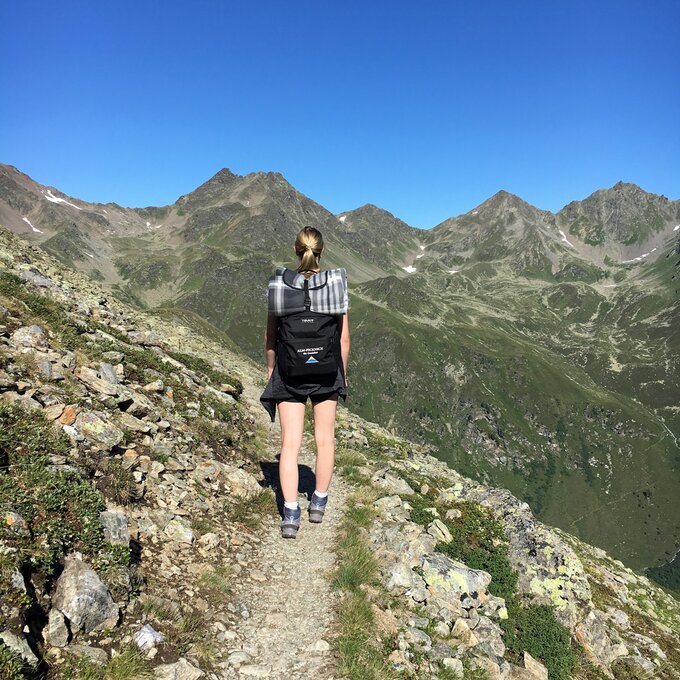 Gesagt, getan - wir starteten ins Abenteuer „Almpicknick“ am frühen Sonntagmorgen. Für unsere Wanderung hatten wir perfektes Wetter. Ein richtiger Sommertag lag vor uns und wir starteten - aufgrund unseres straffen Programms - gleich mit einer der ersten Gondeln hinauf aufs Fisser Joch. Schon in der Schönjochbahn konnten wir erahnen, dass uns ein traumhafter Tag mit Sonne pur bevor stand. Gerade an solchen Tagen kann man der Hitze – mit Temperaturen von über 30 Grad – super mit einem Besuch am Berg entweichen. Aber Vorsicht: Eincremen nicht vergessen! Gerade am Berg ist die UV-Strahlung der Sonne besonders hoch.