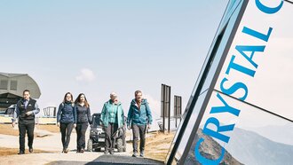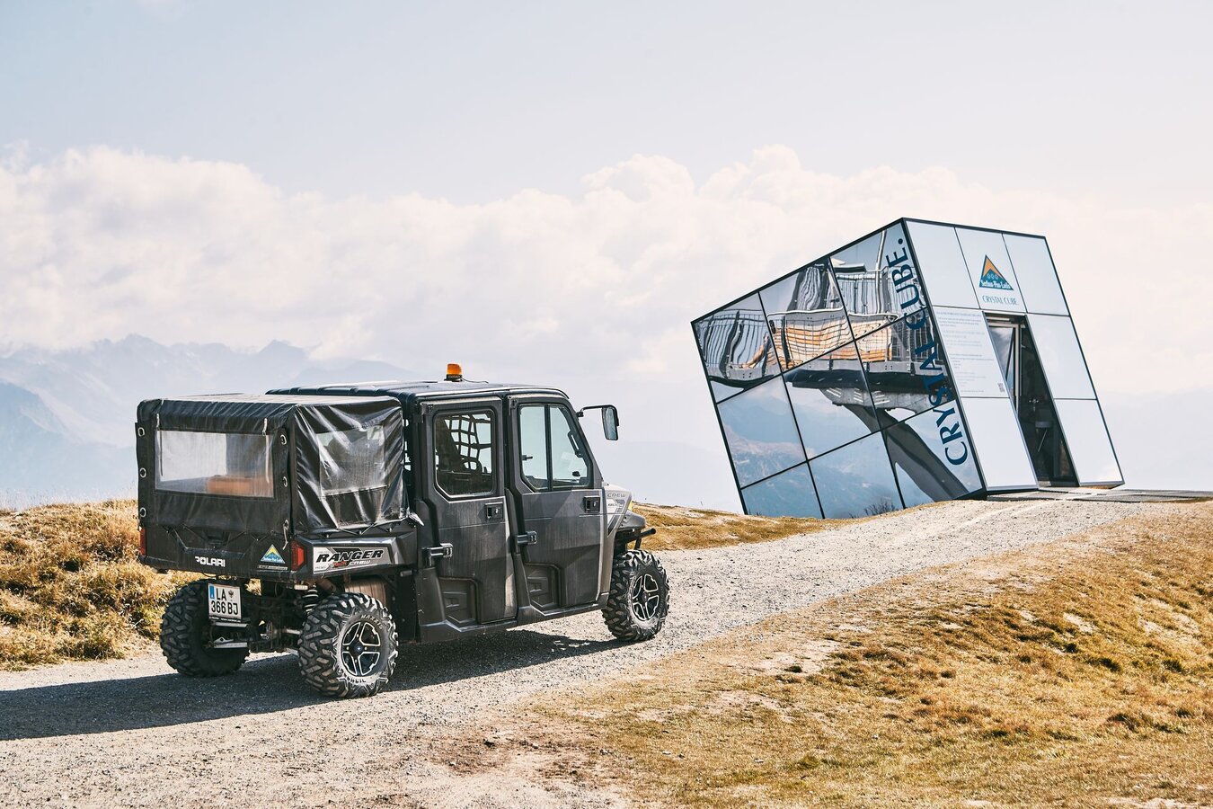 Der Crystal Cube ist schon ein Phänomen für sich. Die Hülle des Gourmet-Würfels erinnert mich ein wenig an HARRY POTTER. Wenn er nämlich unentdeckt bleiben will, nutzt er seinen Tarnumhang: Damit kann er zwar alles sehen, bleibt aber vor den Blicken anderer verborgen. So verhext geht es gewissermaßen auch beim Crystal Cube zu. Im Inneren des Würfels fühlen wir uns quasi wie unter einem TARNUMHANG: Von außen gelingt es nämlich nicht, einen Blick durch die verspiegelten Scheiben zu erhaschen, nur von innen eröffnet sich ein beeindruckendes Gipfelpanorama. Also uns beeindruckt der Ort unseres heutigen Mittagessens.