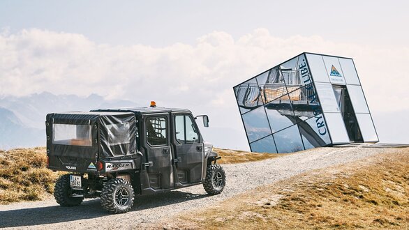 Der geneigte Würfel, in dem insgesamt acht Personen speisen können, thront mit stolzer Brust hoch oberhalb von Fiss und gibt mit seinem futuristischen Aussehen ganz schön an. Auf den ersten Blick könnte es ebenso ein KUNSTWERK sein. Bereits vom Dorf Fiss aus kannst du ihn sehen. Schon entdeckt? Den Zwölferkopf nennt er sein Zuhause. Immer mit dabei: der Wind. An zahlreichen Tagen funkelt sein glattes Äußeres kitschig in der Sonne. Er trotzt dem hochalpinen Wetter tagein & tagaus und steht beharrlich schräg in der Berglandschaft neben der Bergstation der Almbahn. Beim zaghaften Betreten des geneigten Würfelrestaurants WACKELT nichts. Der Kubus bietet uns einen sicheren und vor allem genussreichen Unterschlupf. Wir fühlen uns sicher und der Magen knurrt schon. Peter schließt die Türe hinter sich.