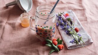 - Mit selbstgemachtem Sirup (Holunder, Beeren, Minze, Brennnessel etc.) süßen und/oder mit Früchten (z.B. Äpfel), Beeren (z.B. Himbeeren), Kräutern (z.B. Thymian) oder Gemüse (z.B. Gurken) verfeinern.