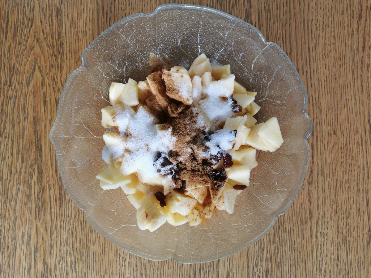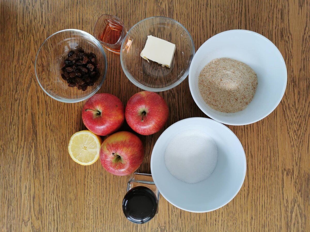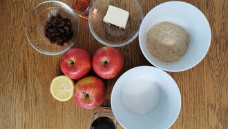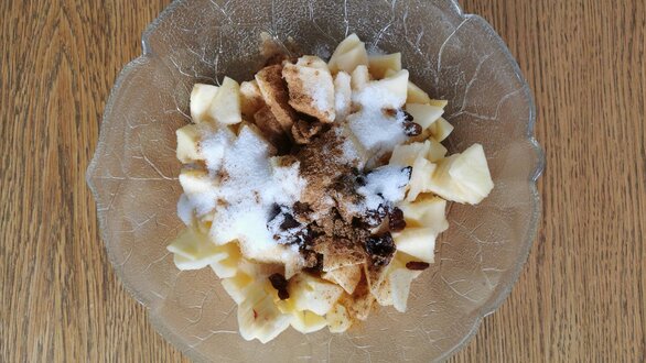 Äpfel schälen, vierteln, entkernen und blättrig schneiden, mit den Geschmackszutaten und den Rosinen vermengen. Butter zerlassen und die Brösel darin kurz anrösten, beiseite stellen.