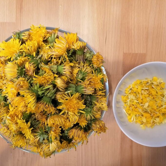 Die Blüten des Löwenzahns am besten in einen Papiersack geben. Beim Pflücken kann schon mal etwas Milch aus den Stängeln freigesetzt werden. Das Sammeln lohnt sich aber. Die Honigalternative noch am Sammeltag zubereiten, da sich die Blüten sehr schnell schließen. Von den Himmelschlüsseln benötigst du nur die dottergelben Blüten. Diese kannst du in Ruhe zuhause aus ihrem Kelch zupfen. Der Duft der echten Himmelschlüssel ist einzigartig. Vertrau beim Pflücken deiner Nase. Die Frühlingsblüher wachsen erfreulicherweise bei uns im Garten. Dort kann ich sie für meinen Sirup bedenkenlos ernten.