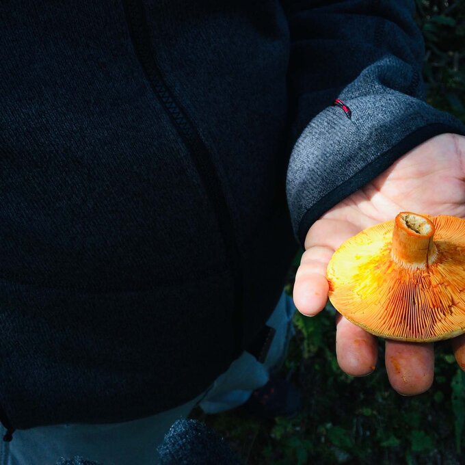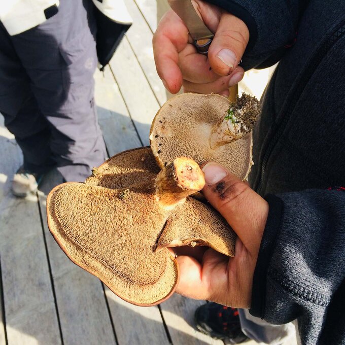 Der Reizker und der Hexenröhrling sind mir besonders in Erinnerung geblieben. Ist das Zauberei oder ein Streich der Natur? Der erste Pilz zählt zu der orange milchenden Pilzart. Sein oranges Kleidchen färbt auf den Händen des Pilzsammlers ab. Der Speisepilz Hexenröhrling treibt es ebenfalls sehr bunt. Beim Aufschneiden "blaut" er. Wird er verarbeitet, ändert er erneut seine Farbe. Ein Teilnehmer erzählte mir, dass dieser Pilz viel aromatischer sei, als etwa der viel bekanntere Steinpilz.