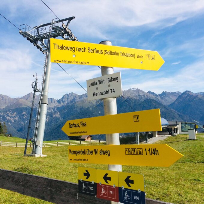 Um zurück nach Serfaus zu gelangen, hat der Wanderer zwei Möglichkeiten. Über den Weg Nr. 9 bzw. 4 (breiter Fahrweg = kinderwagentauglich) ist Serfaus nach etwa zwei Kilometern erreicht.  Zweite Möglichkeit: Oder rechts neben der Königsleithebahn (direkt gegenüber vom Leithe Wirt) auf den Thaleweg nach Serfaus schreiten. In etwa 20 Minuten erreicht man die, am westlichen Dorfende liegenden, Talstationen.  Der Weg verläuft teils serpentinenartig hinunter nach Serfaus (nicht kinderwagentauglich).