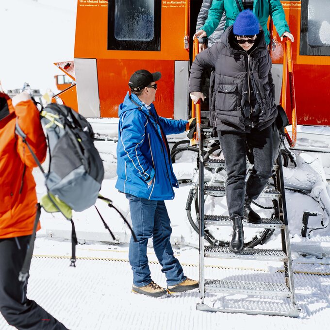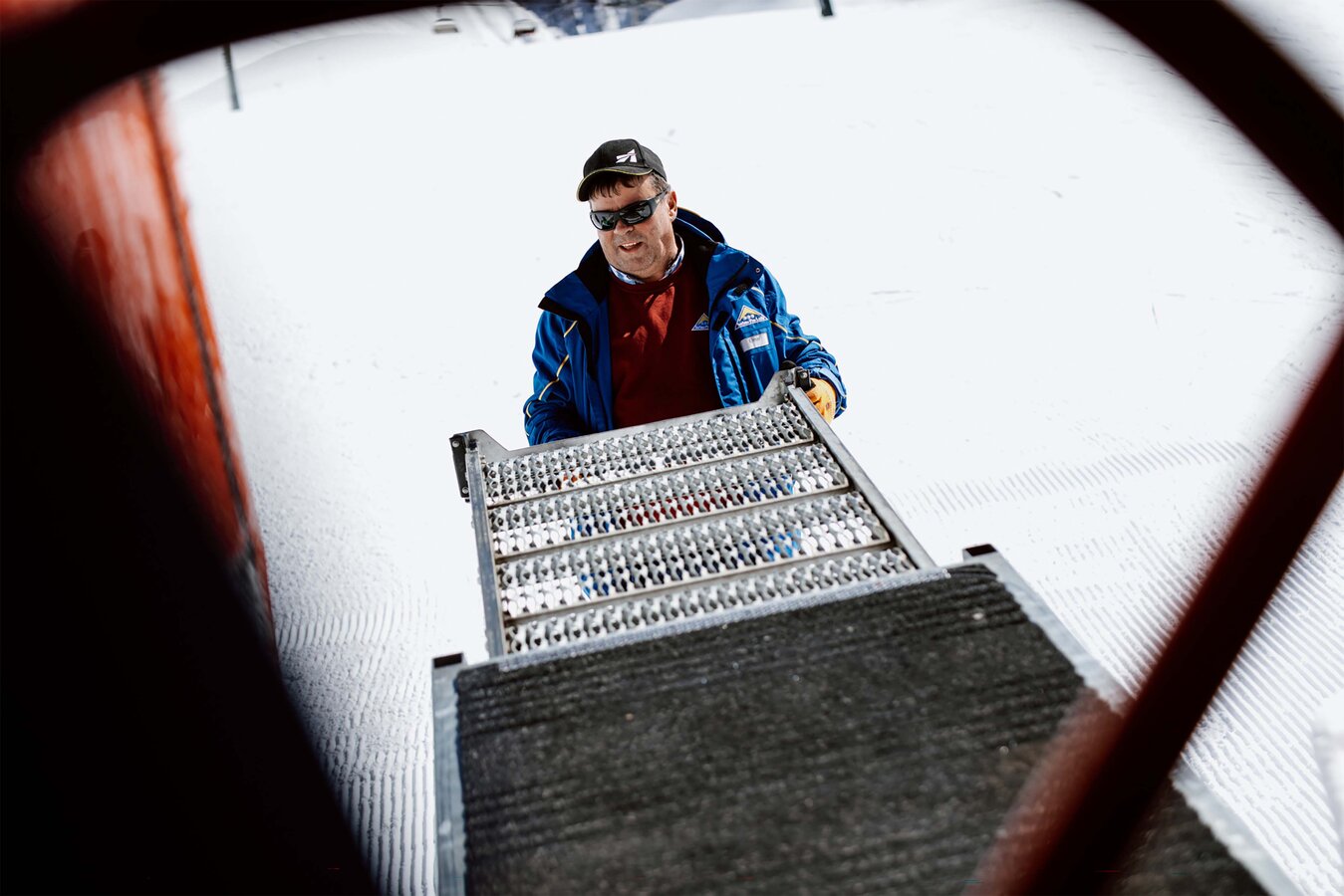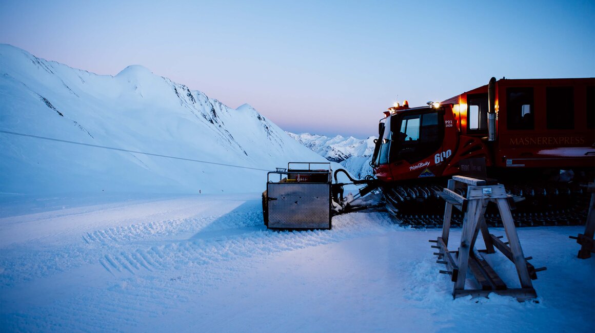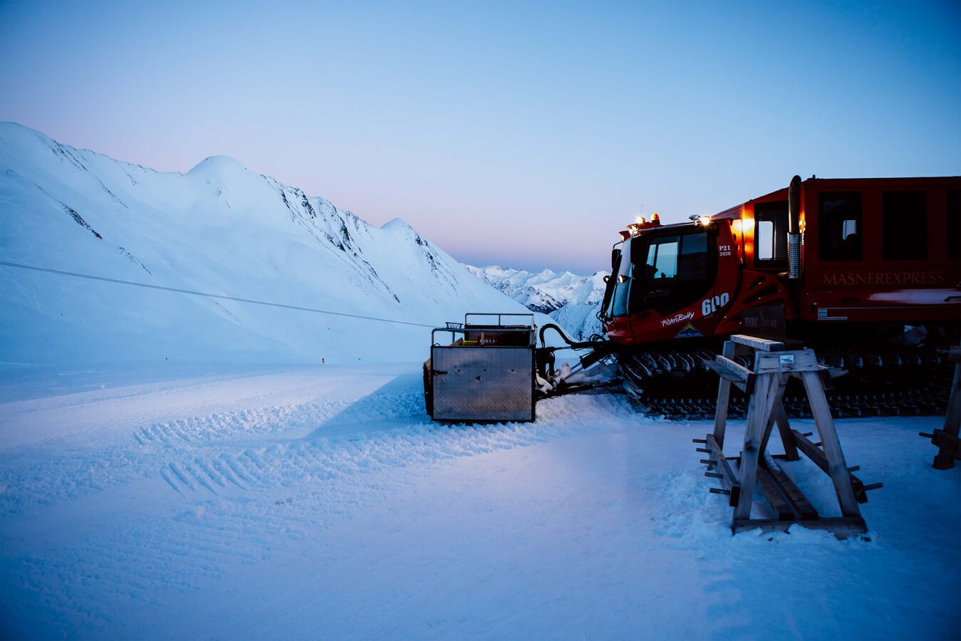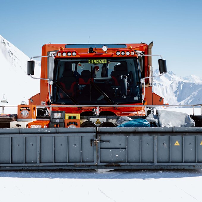 Sein Arbeitsgerät, die zum Masner Express umgebaute Pistenraupe, bringt bis zu 16 Gäste auch ohne Ski vom Tal oder von der Bergstation der Lazidbahn aus in den Masner und zurück. Je nach Abfahrtsort dauert die Fahrt bis zu einer Stunde. Zusätzlich beliefert Elmar bei seinen Fahrten die Restaurants im Skigebiet, holt Müll ab und an diesem Tag nimmt er sogar ein Paket mit auf seine Fahrt. Paketdienst im Skigebiet? „Nein, das war eine Ausnahme“, sagt er. Seine Arbeitstage beginnen früh und enden spät: Wenn die wöchentliche Sonnenaufgangsfahrt Sunrise Hexensee ansteht, starten seine Tage mitunter schon um Viertel vor fünf Uhr. Bringt er die Gäste vom exklusiven Sunset Dinner Masner zurück ins Tal - so wie am Tag des Interviews – dann endet seine Arbeitszeit erst gegen halb zehn Uhr abends.