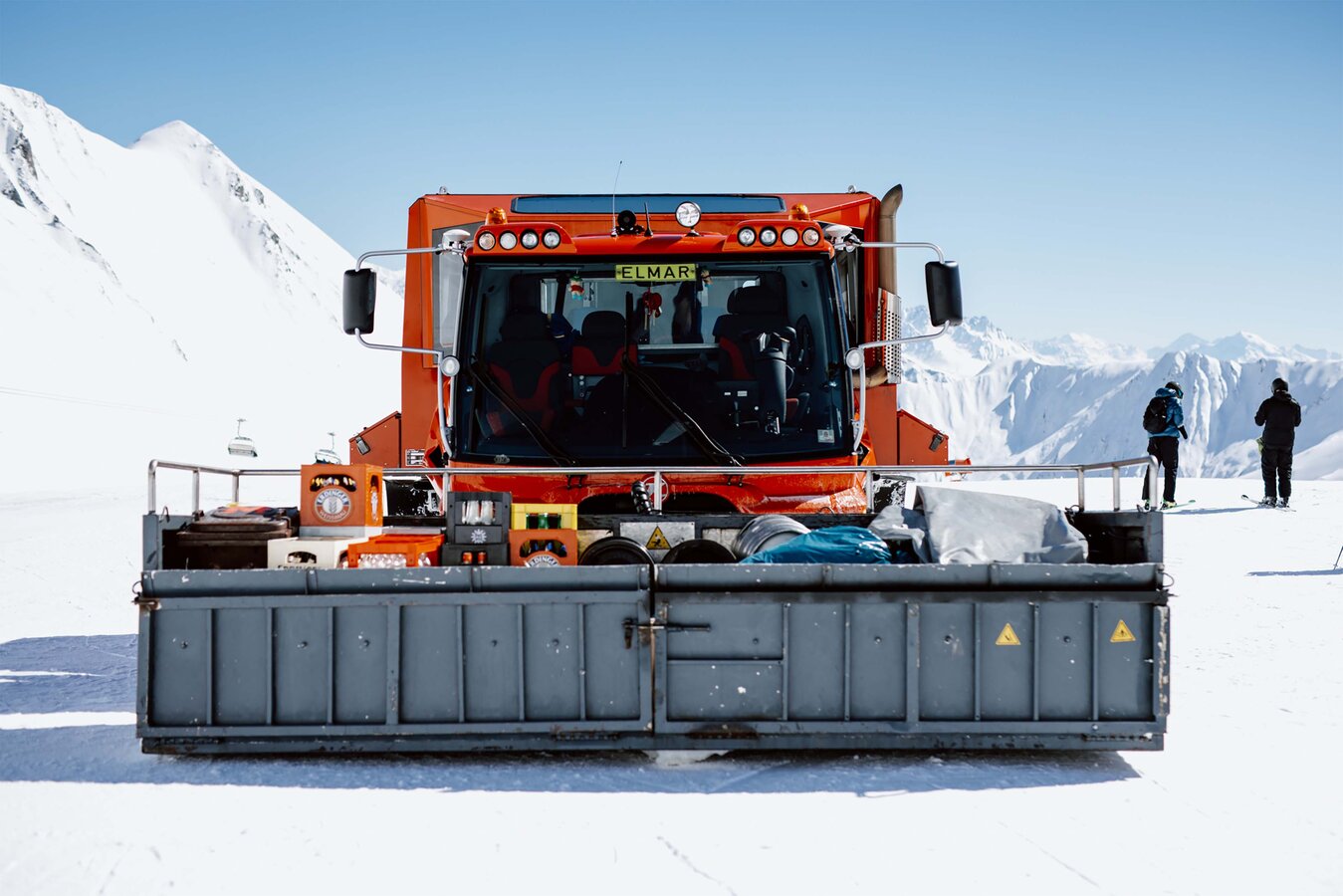 Auch auf der Rückfahrt bleibt Elmar immer wieder einmal stehen, um die Ladung vorne – heute sind das unter anderem leere Glasflaschen – neu zu sichern. Nach mehr als 30 Berufsjahren weiß er, auf welche Kleinigkeiten er aufpassen muss, um Ladung und Gäste unfallfrei ins Tal zu bringen. „Angefangen habe ich mit einer Maschine, die 170 PS hatte, jetzt fahr ich mit 480 PS und es gibt bei weitem noch stärkere Pistenraupen“, erinnert sich Elmar. Um auf dem neuesten Stand der Technik zu bleiben, hilft nur üben, üben, üben. Angesprochen auf die Frage, ab wann man das Pistenraupenfahren denn wirklich kann, lacht er nur. „Manch einer kann es gleich, andere lernen es nie“, sagt er und lenkt die schwere Maschine unaufgeregt über den letzten steilen Abhang an diesem Tag.