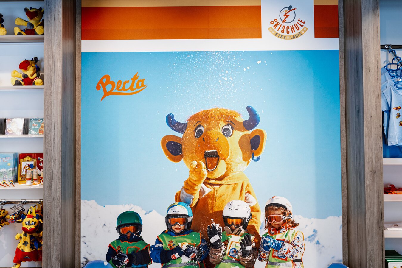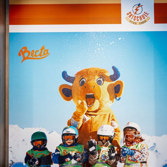 Was ihren kleinen Gästen in der Kinderskischule Fiss-Ladis gefällt, das hat Eva im Gespür – und sie hat im Laufe der Jahre viel Erfahrung dazu gesammelt. Ihren Riecher für kindliche Begeisterung hat sie auch bei der Entwicklung des Skischul-Pausenprogrammes mit Maskottchen Berta unter Beweis gestellt. „Berta wurde vom Fisser Fully Rietzler eigentlich als Kinder-Beförderungsmittel für den Sommer entwickelt. Ich habe dann versucht, Berta auch in den Winter und in die Skischule einzubauen. Eine Mitarbeiterin, die auch Schneiderin ist, hat mir ein erstes Kostüm für Berta geschneidert. Die freundliche gelbe Kuh mit den großen Augen und gekleidet in einer roten Hose ist gleich gut angekommen“, erinnert sie sich. Mittlerweile ist Berta aus der Skischule Fiss-Ladis nicht mehr wegzudenken. Und Eva hat sogar ein Kinderbuch über die Abenteuer des Maskottchens selbst verfasst. Woher nimmt sie all ihre Ideen? „Die sprudeln einfach so“, lacht sie. „Die kreative Arbeit mache ich meistens im Frühjahr und Sommer, wenn ich mehr Zeit habe. Dann bin ich unterwegs, in der Natur oder auf Reisen, lese viel und lasse mich inspirieren.“