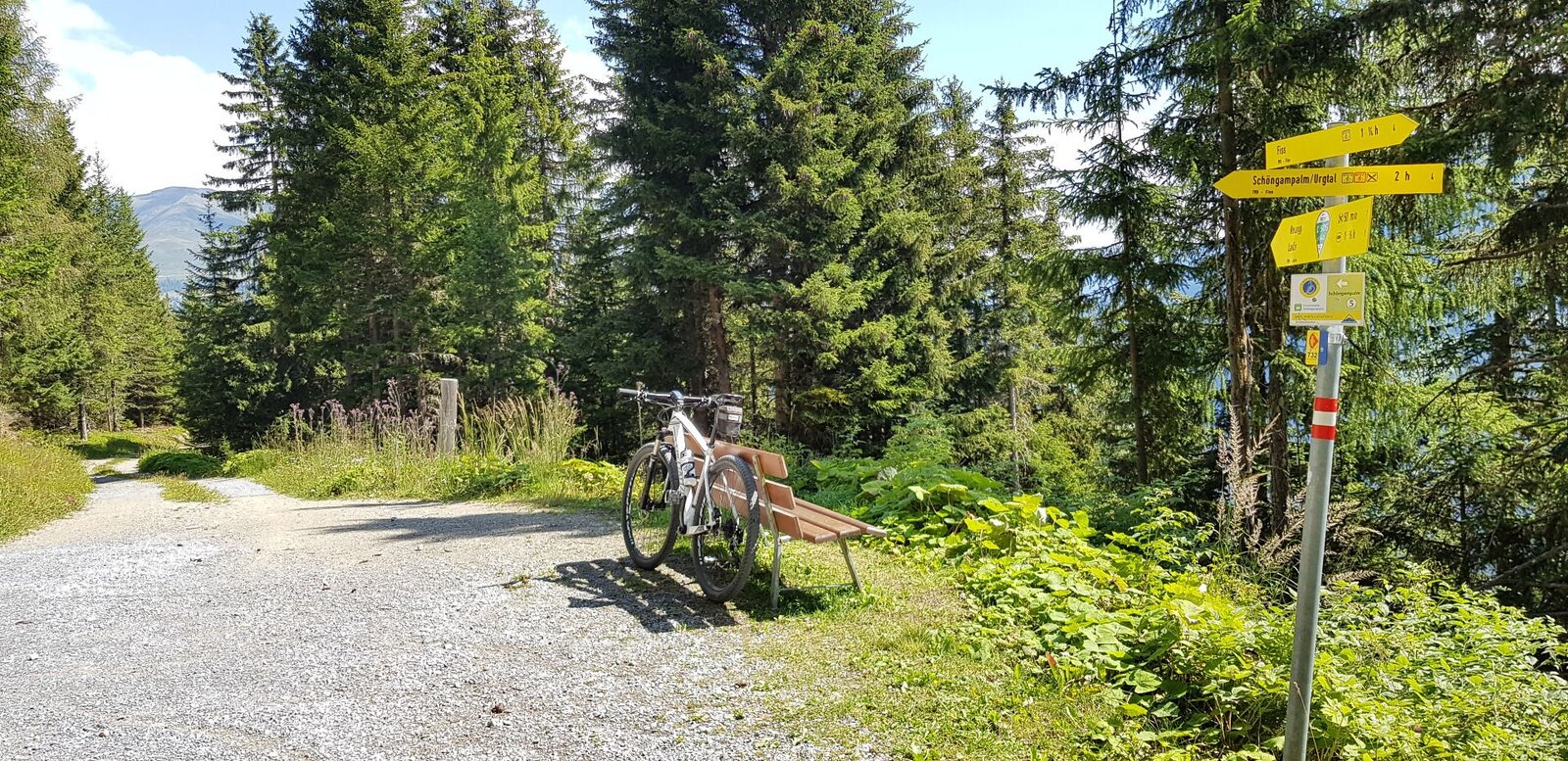 Vom Start beim Bikepark geht es dem asphaltierten Radweg entlang nach Fiss ins Zentrum  und Richtung Kulturhaus, kurz vor dem Kulturhaus (F009) links halten und am Ende der kurzen Steigung (F008) rechts Richtung Obladis. Beim Wegweiser F007 links bei dem Feldweg aufwärts bis zur Sägegasse (F2025), hier Rechts Richtung Rabuschl. Dem Urgtalweg folgen bis zum Wegweiser F031, hier rechts auf dem von unten kommenden Weg leicht abwärts bis zum Wodeturm. Vom Wodeturm geht's an Neuegg vorbei dem asphaltierten Fahrweg nach Ladis. Achtung Straßenverkehr! In Ladis durch das Zentrum zur Talstation Sonnenbahn Ladis-Fiss. Mit der Bahn zurück nach Fiss, durch das Dorf zum Ausgangspunkt Bikepark zurück.