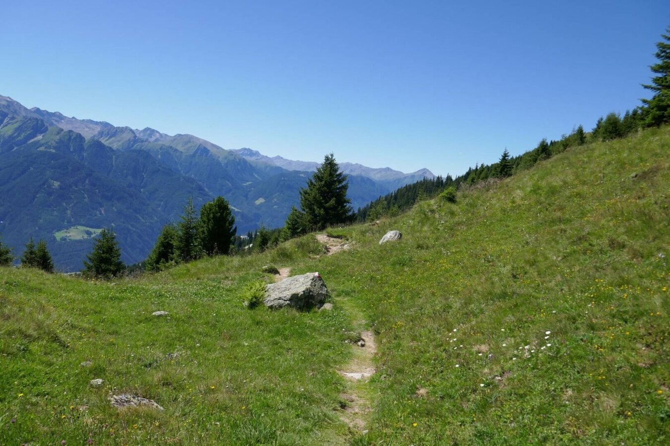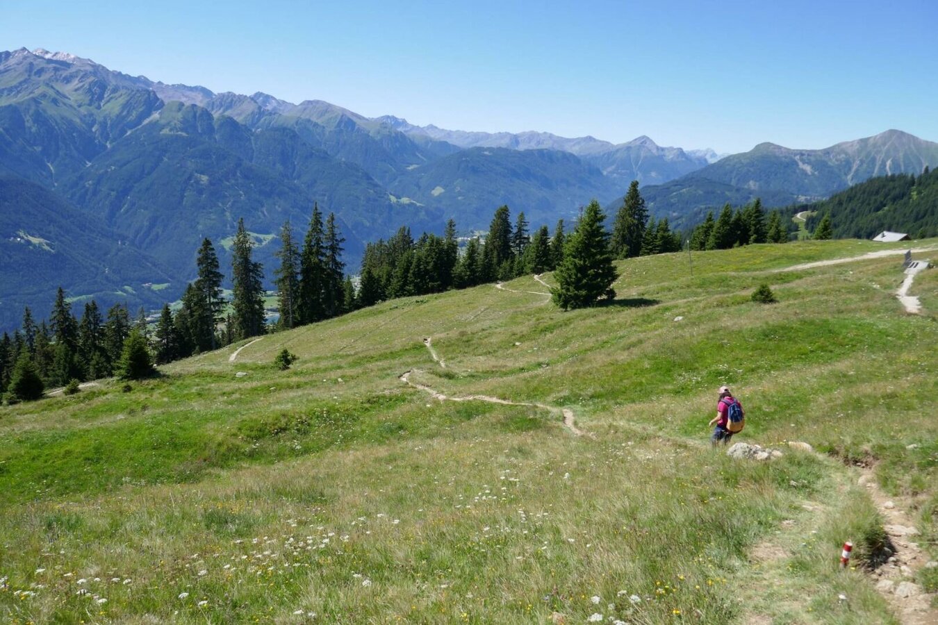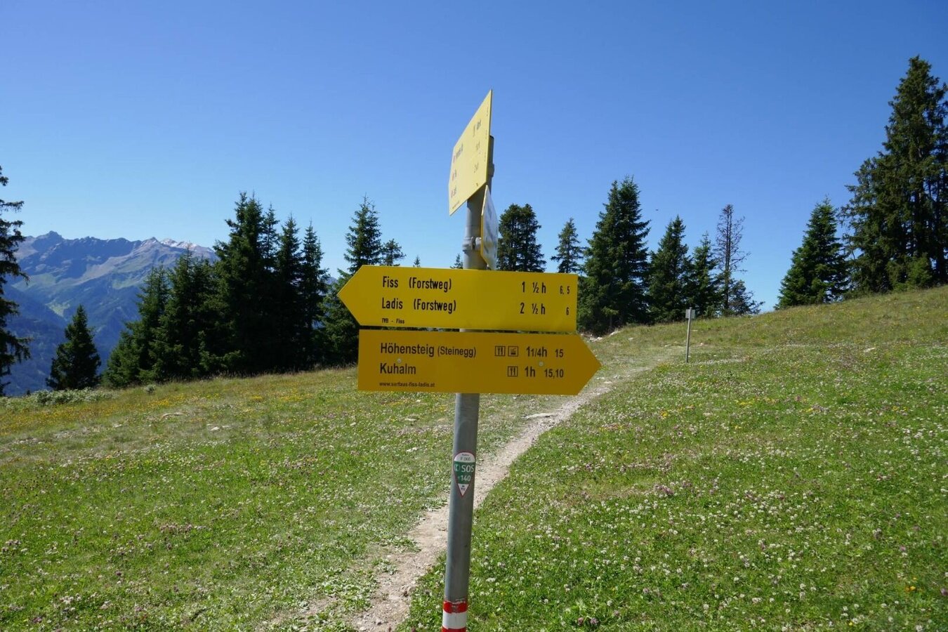 Mit der Schönjochbahn zum Fisser Joch (F087), nun zum Schönjöchl Kreuz (F079) und über Frommes, Weg Nr. 5 (F072), zur Frommeshütte (F066/067). Weiter auf dem Fisser Höhenweg Nr. 15 bis Gample (F065), links hinunter bis zum Fahrweg Nr. 10 (F057). Rechts abbiegen und dem Fahrweg bis zur großen Weggabelung (F059) folgen. Ab dort links abbiegen und in 10 Minuten zur Kuh Alm (F121). Abstieg nach Fiss über den Fahrweg Nr. 9 oder via dem Hexenweg zum Waalsteig Nr. 8.
