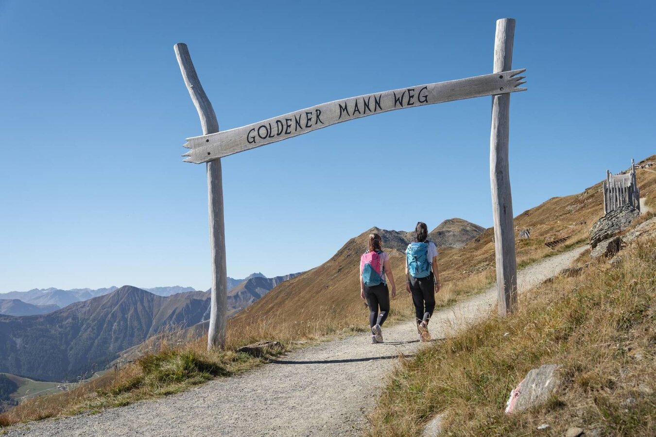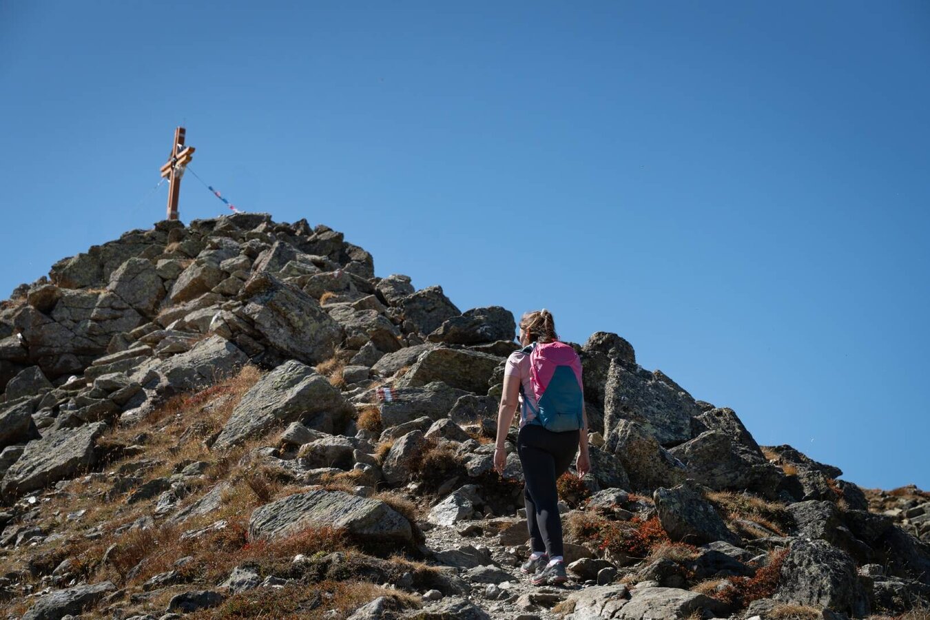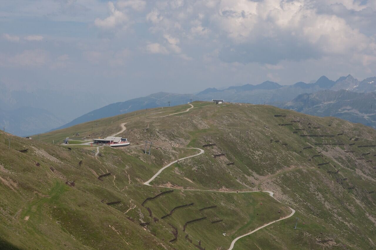 Der direkte Anstieg von Fiss über die Möseralm zum oberen Sattelkopf, dem Fisser Gipfelkreuz. Bis zur Möseralm ist der Weg eine asphaltierte, schmale Fahrstraße, im Anschluss ein Bergpfad, der sich in vielen Kehren immer steiler werdend mit schöner Aussicht bis zum Gipfel hochwindet.