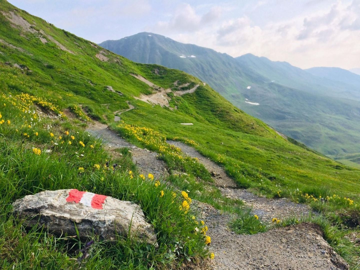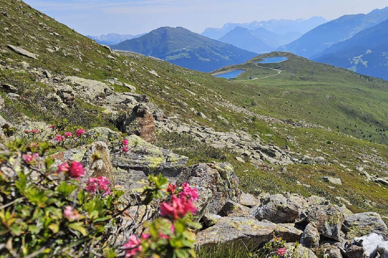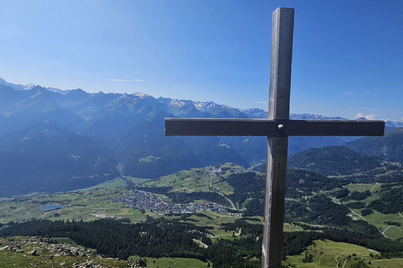 Vom Steinegg (F061) auf dem Fahrweg Nr. 9 bis zur zweiten Wegkehre (F062). Hier zweigt rechts der Fisser Höhensteig und der Karpensteinsteig ab (F063). Nach wenigen gemeinsamen Metern links mäßig steil über Almwiesen zu einem zimmergroßen Felsblock (F094, Karpenstein). Nun den Fahrweg überquerend, etwas steiler hinauf, zwischen den Lawinengalerien hindurch auf den breiten Gratrücken (F084). Links führt der Weg in wenigen Minuten zum Fisser Joch (F087) mit Seilbahn und Restaurant, rechts gelangt man über den sanften Gratrücken zum Schönjöchl-Gipfelkreuz (F079).