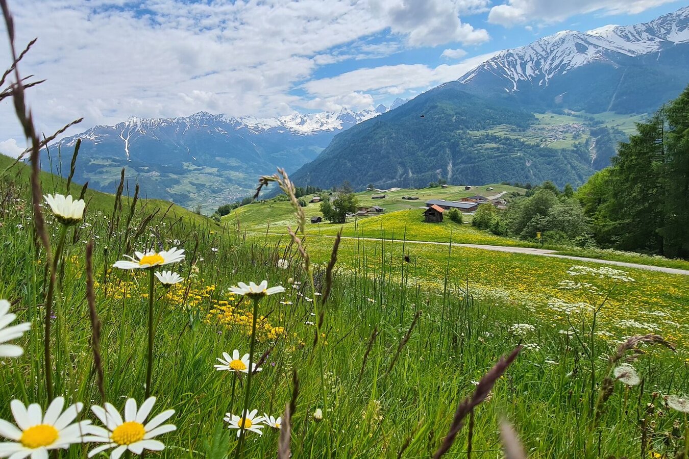 Vom Gemeindehaus (L006) folgt man dem Razilweg zum Ortsrand. Von dort geradeaus hoch bis zur Abzweigung und dann nach links (L002). Unter dem Urschbühel vorbei, dann kurz ziemlich steil hinauf und allmählich flacher werdend nach Fiss (F001).