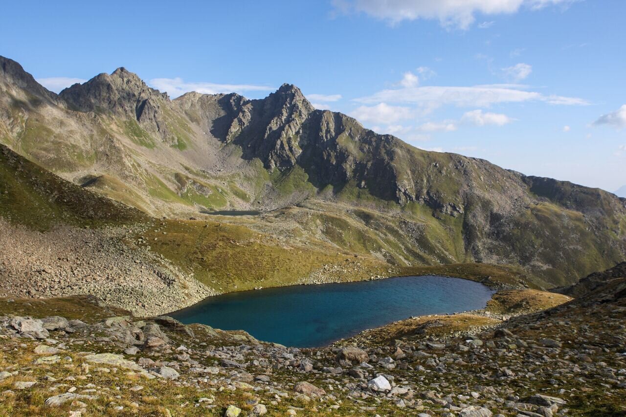 Den Oberen Spinnsee erreicht man wie zuvor bei Weg 16 beschrieben. Vom See nun links hoch über Steinkare zur Spinnscharte 2.681 m (F106a) und über einen Blockgrat mit schöner Steiganlage und kurzer Drahtseilversicherung zum Gipfel 2.936 m (S275). Abstieg eventuell über Kübelgrubenscharte (S276) und Urgjoch (S271) zum Komperdell (S103) 3 Stunden, oder über Planskopf (S260) und den Gratweg zurück zum Fisser Joch (F087).