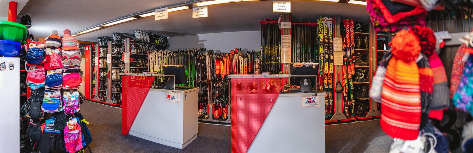 In unserem Verkaufssortiment befinden sich unter anderem Helme, Mützen, Ski-und Sonnenbrillen, Skisocken, Handschuhe und vieles mehr.
