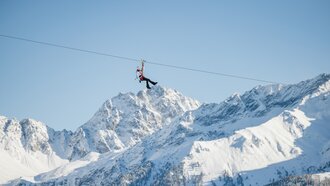 Im Winter wird der Fisser Flieger zum rasanten Höhenflug über eine glitzernde Schneelandschaft. Warm eingepackt startest du ins Abenteuer und gleitest mit beeindruckender Geschwindigkeit über die weiße Bergkulisse hinweg.