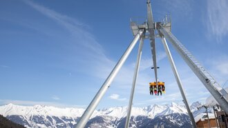 Die Skyswing in Fiss bietet ein unvergessliches Erlebnis: In rund 22 Metern Höhe wirst du angeschnallt, langsam nach oben gezogen – und dann im freien Fall in die Tiefe geschwungen. Ein Moment absoluter Stille, gefolgt von purer Action und Adrenalin.