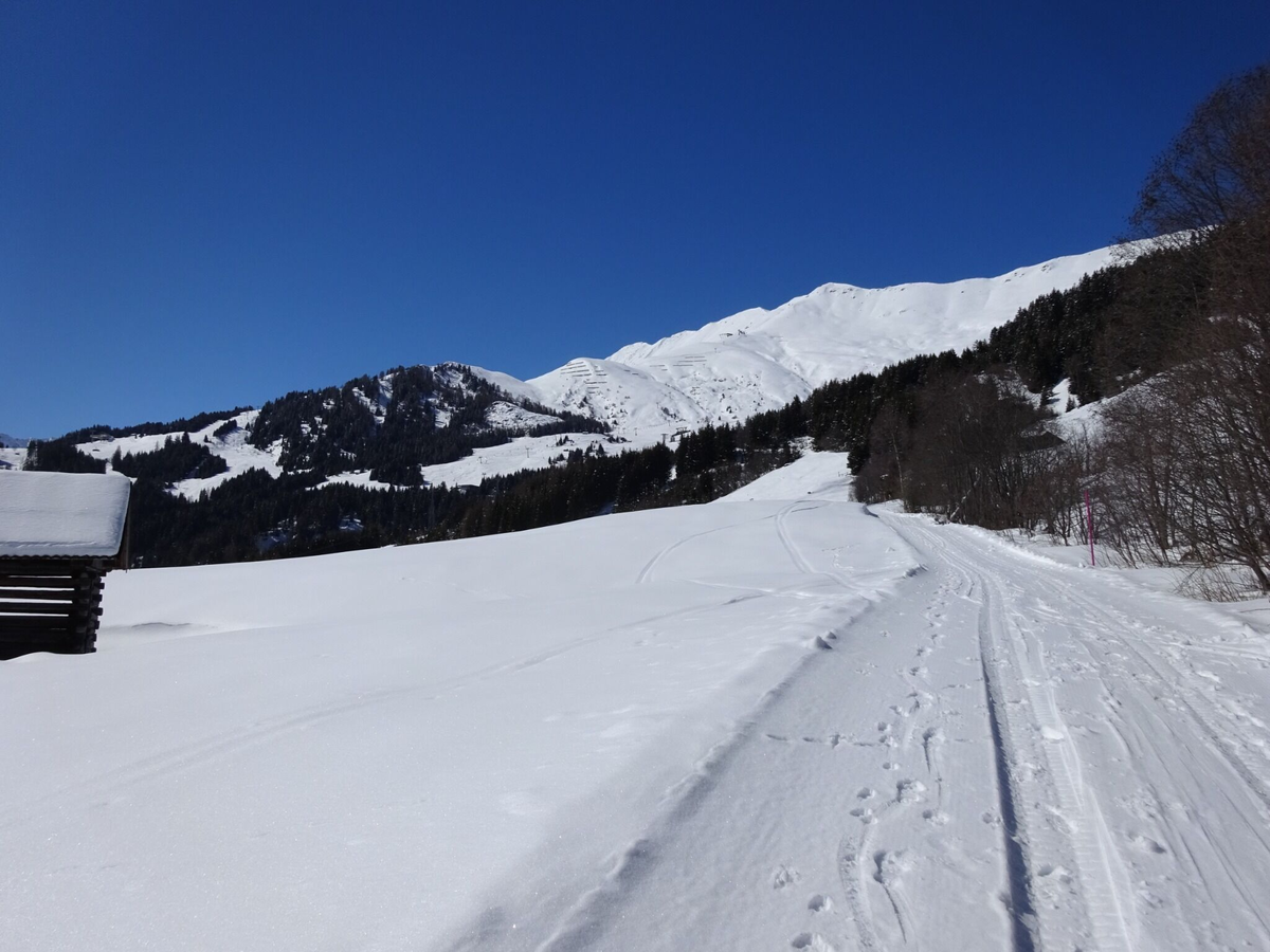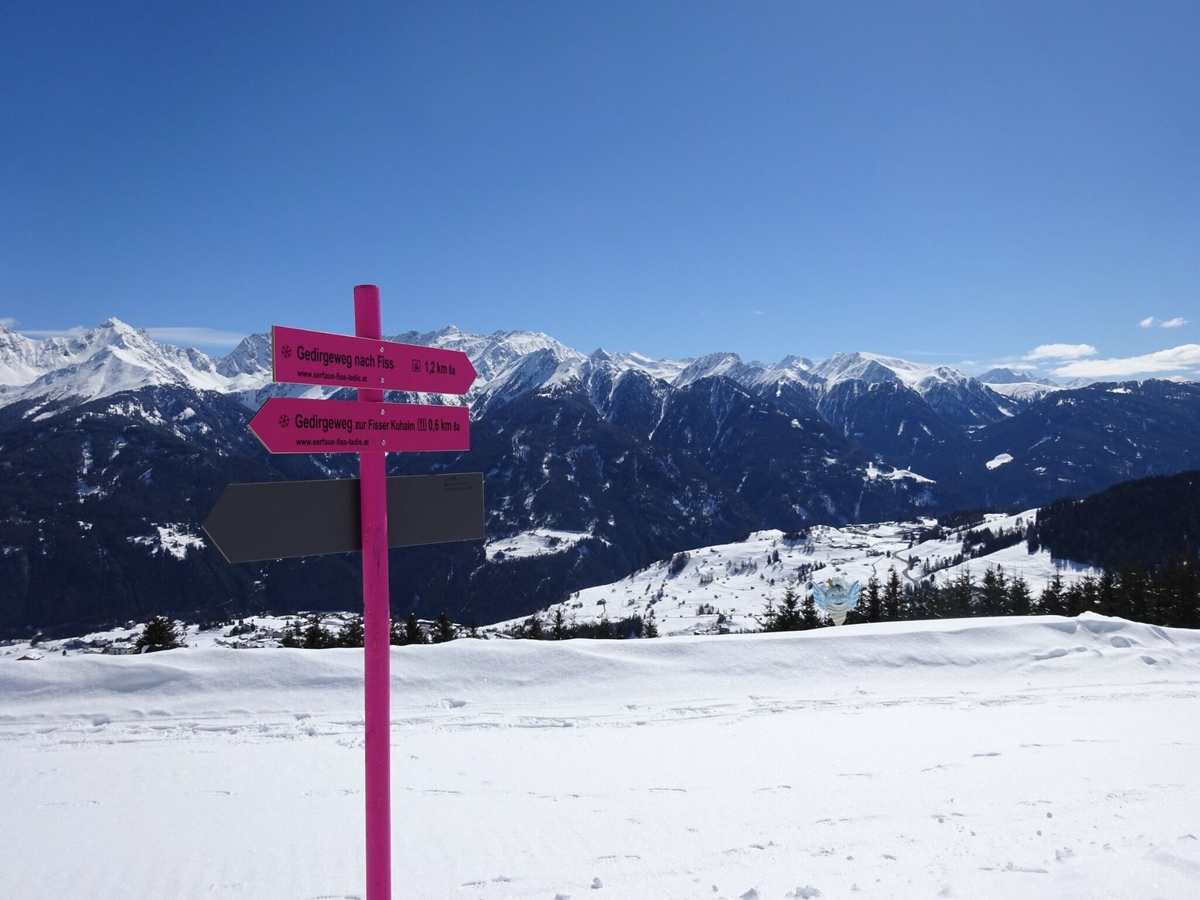 Unterhalb der Kuh Alm Fiss und Rodelbahn der Beschilderung folgend über die Gedirgewiesen nach Fiss.