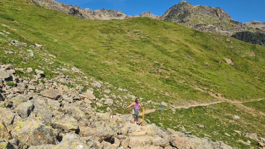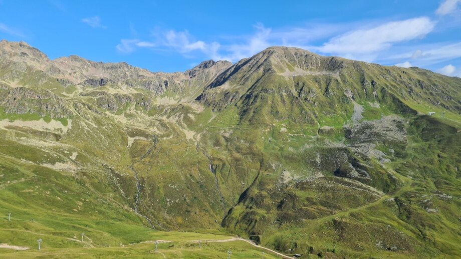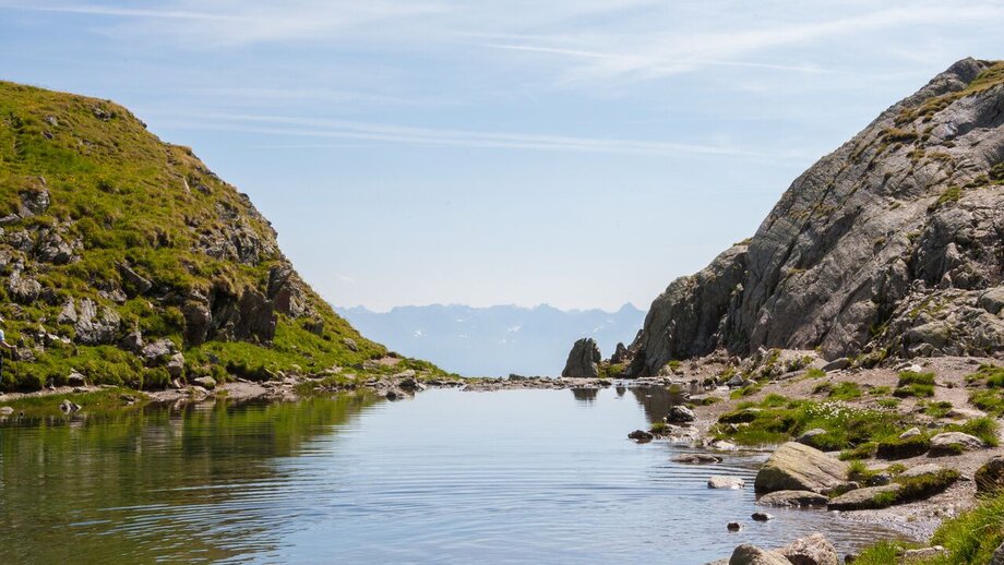 From the Lazidbahn top station (S301) start on the vehicle track to the Scheid (S217). From the signpost (S218) behind the cable car station onto the Murmeltiersteig trail 25a and over the Kitzköpfl to the Furglersee lake (S211). From the lake follow the Weitwanderweg trail 702 (trail no. 21), cross the Malfristwiesen to the Komperdell (Kölner Haus).