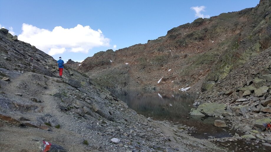 From the Lazidbahn top station (S301) on wide vehicle track or via the Böderköpfe to the Scheid (S217), at the signpost (S219) turn onto trail no. 26 to the crossing to the Pezid (S224). Ascent over trail no. 30 to the Gadratschjoch (S227). Continue on the vehicle track and hike the last meters along the ridge to the summit. Descent to the cable car station and over the narrow, steep ridge to the Pezidsattel (S292). Continue over the Vordere Valgeier no. 31a to the Lader Moos (S289). From there onto trail no. 31b to the Böderhütte (S286) and on trail no. 30 to the Lazid Kreuzchen (S280). On wide trail back to the Komperdell (Kölner Haus).