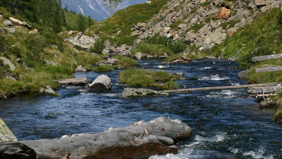 From the Fisser Joch (F087) on the Spinnseensteig path no. 16 into the Urgtal valley, at the bridge (F107) turn right onto trail no. 17 and through the valley to the Schöngampalm (F039).