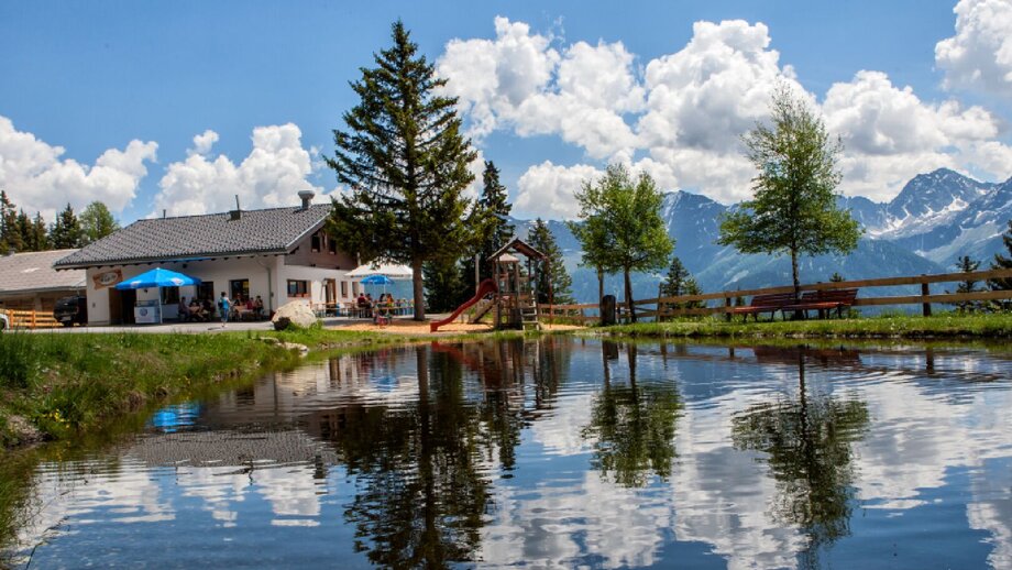 From the village (F010), head up the Sägegasse until just before the sawmill (F011), where you turn left. Shortly after, a field path (F012) begins on the right, which you follow across meadows, partly gently, partly more steeply uphill, until you reach the stream (F123, Waal). Here, the connecting path from the Sonnenbahn-Ladis (F015) joins the Waal Trail. The Waal Trail mostly runs beautifully between bushes and the stream. Just before the Lahnewald, the Waal Trail reaches a bend where it meets the road No. 9 (F119) to Kuhalm (F121) and No. 11 to Möseralm (F113). At the last meadows, a shortcut begins on the ski path (F120) to the right, through the forest, leading to Kuhalm (F121).