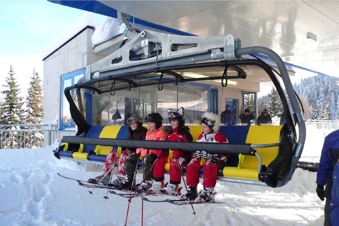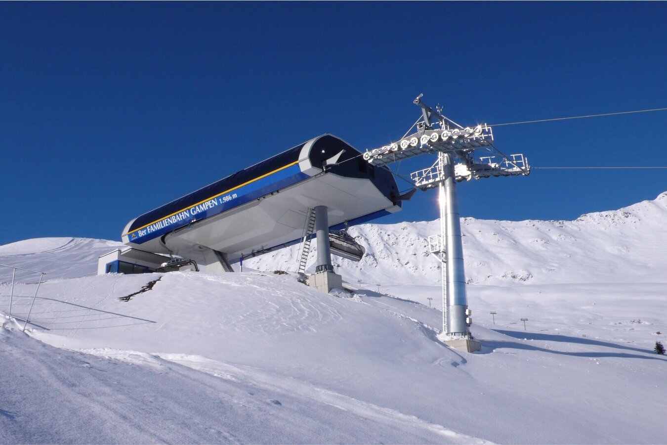 The Familienbahn Gampen was the first child-safe chairlift in the world. The lift is equipped with a weather protection bonnet and seat heating and is ideal for beginners and children. At the entrance there is a special conveyor belt with automatic height adjustment.