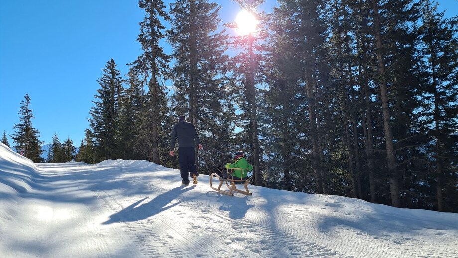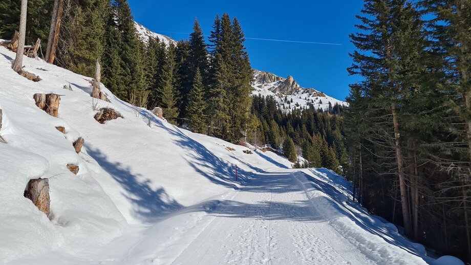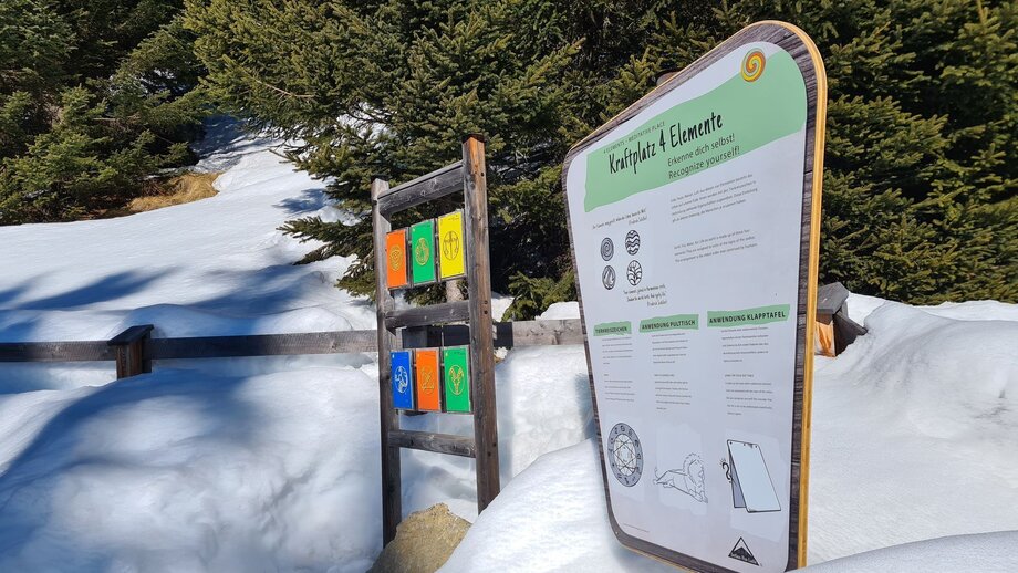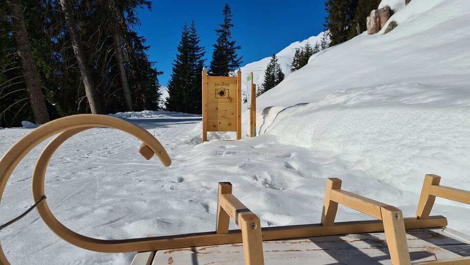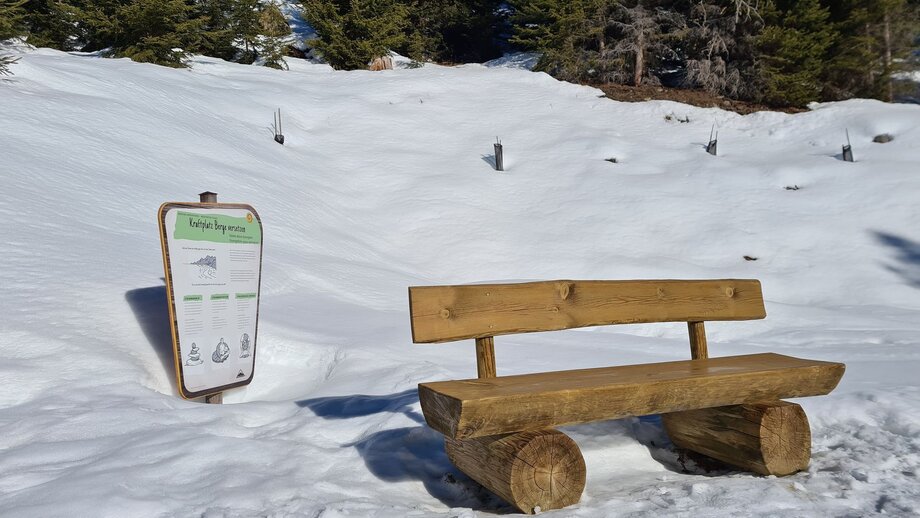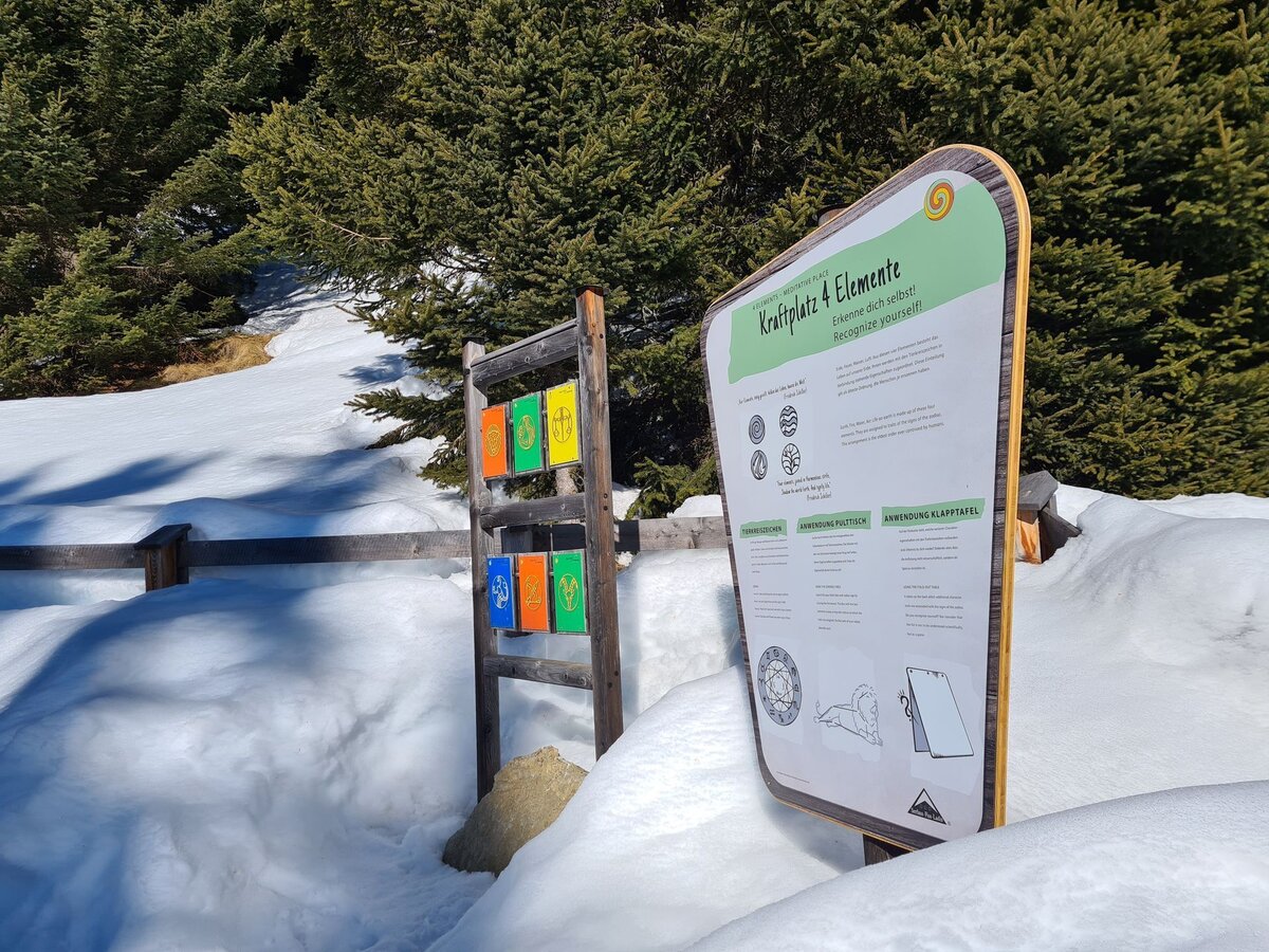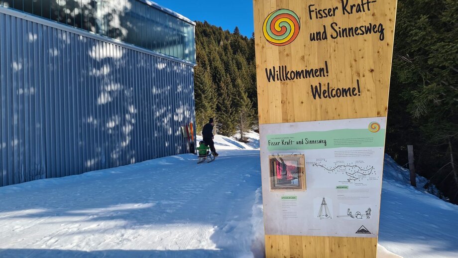From the middle station of the Schönjochbahn (Steinegg), past the entrance portal onto the Fisser Kraft- und Sinnesweg. At the junction (F057) either to the Kuh Alm Fiss, or on trail no. 9 and Tierlehrweg to Frommes Alp.