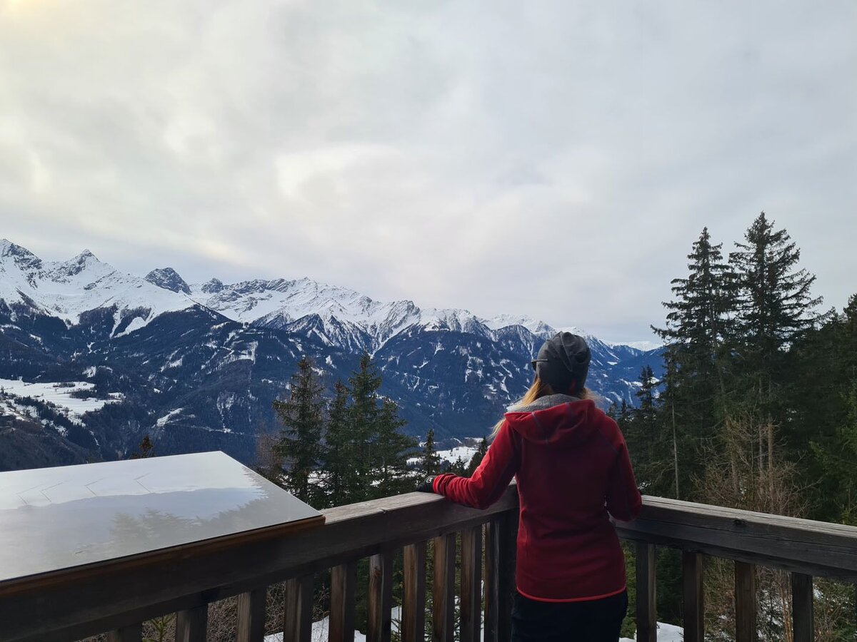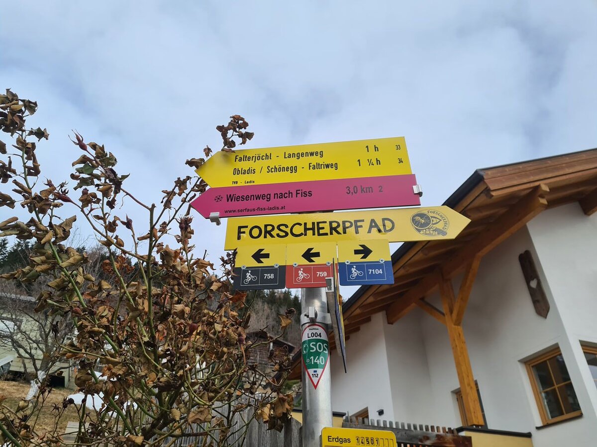 Volg vanaf het einde van het dorp “Razil” de rand van de piste in de richting van Weiberkessl. Sla bij wegwijzer L001 af naar weg nr. 34 en ga verder naar het uitzichtsplatform Schönegg. Dan verder naar Fiss via Rabuschl weg nr. 4 of terug naar de kruising L017 via Falterjöchl naar Fiss of Obladis weg nr. 3.